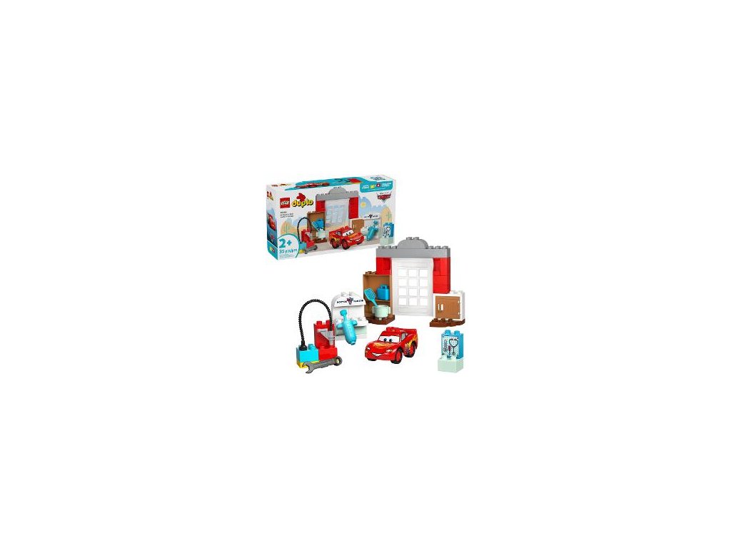Tato stavebnice garáže obsahuje auto Blesk McQueen, automyčku a spoustu doplňků včetně hasáku a ohebné hadice na vodu
