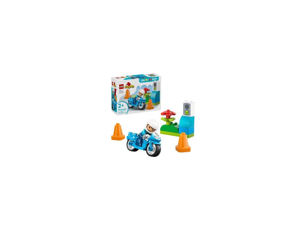 Se stavebnicí LEGO® DUPLO® Město Modrá policejní motorka se malé děti od 2 let vydají na napínavá dobrodružství motorkou, figurkou policistky, kužely a semaforem