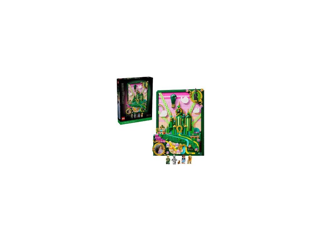Toto umělecké dílo LEGO® zobrazuje Elphabu letící nad Emerald City, Glindu vznášející se v bublině a nechybí Dorotka Galeová, Zbabělý lev, Strašák, Plecháč a pes Toto