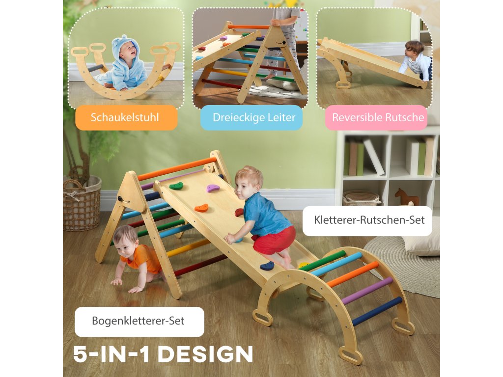 - konstrukce 5 v 1: Tato multifunkční vnitřní prolézačka nabízí batolatům prolézačku trojúhelníkového tvaru, obloukový most, který lze použít i k houpání, a skluzavkovou rampu s lezeckými kameny. Ideální pro četné a rozmanité hodiny hraní v prostorově úsporném provedení