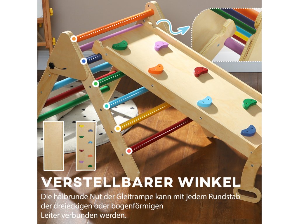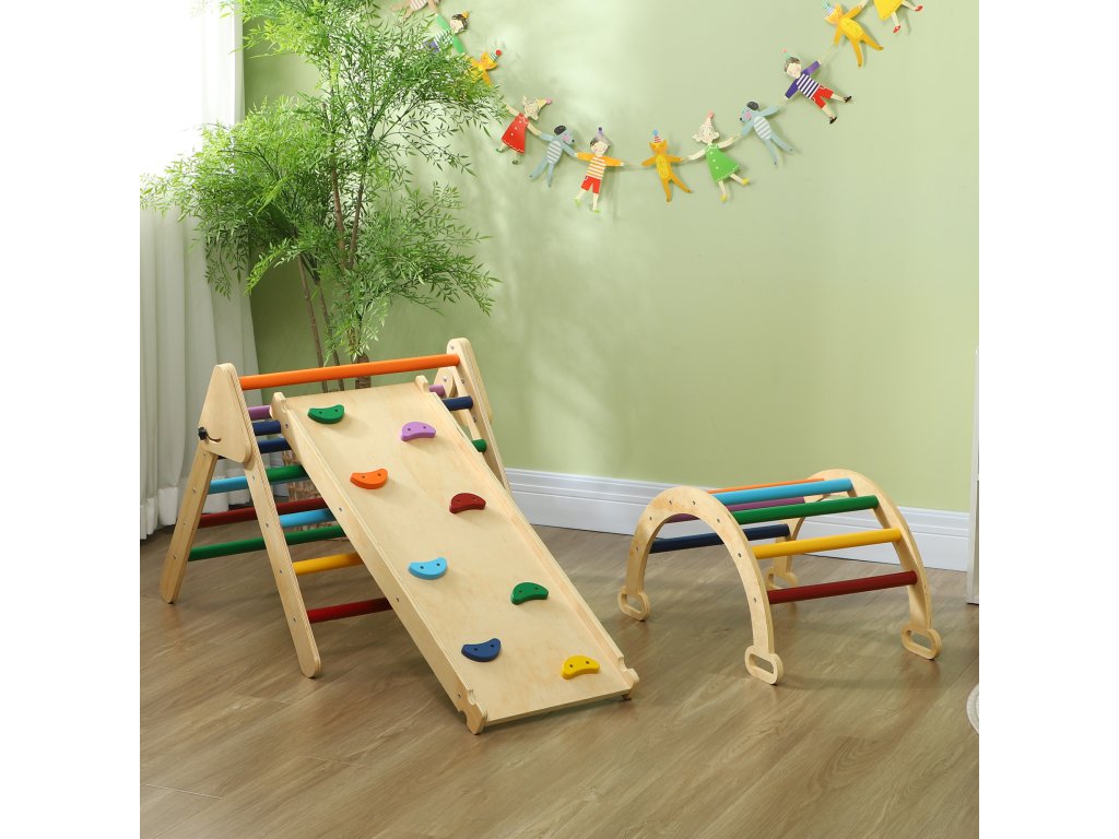 - Nastavitelná a skládací: Tento trojúhelník Pikler lze snadno složit pro úsporu místa při skladování. K rámu lze připevnit rampu a nastavit tak výšku skluzavky tak, aby držela krok s rostoucí touhou vašeho dítěte objevovat