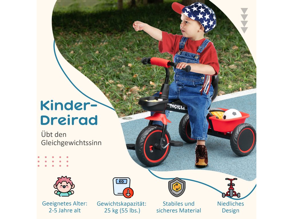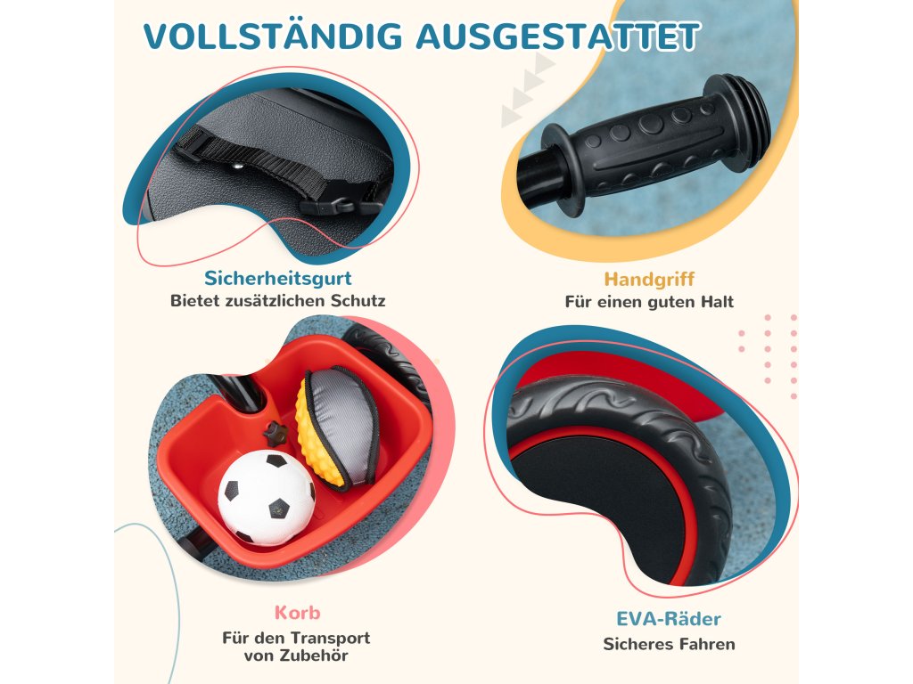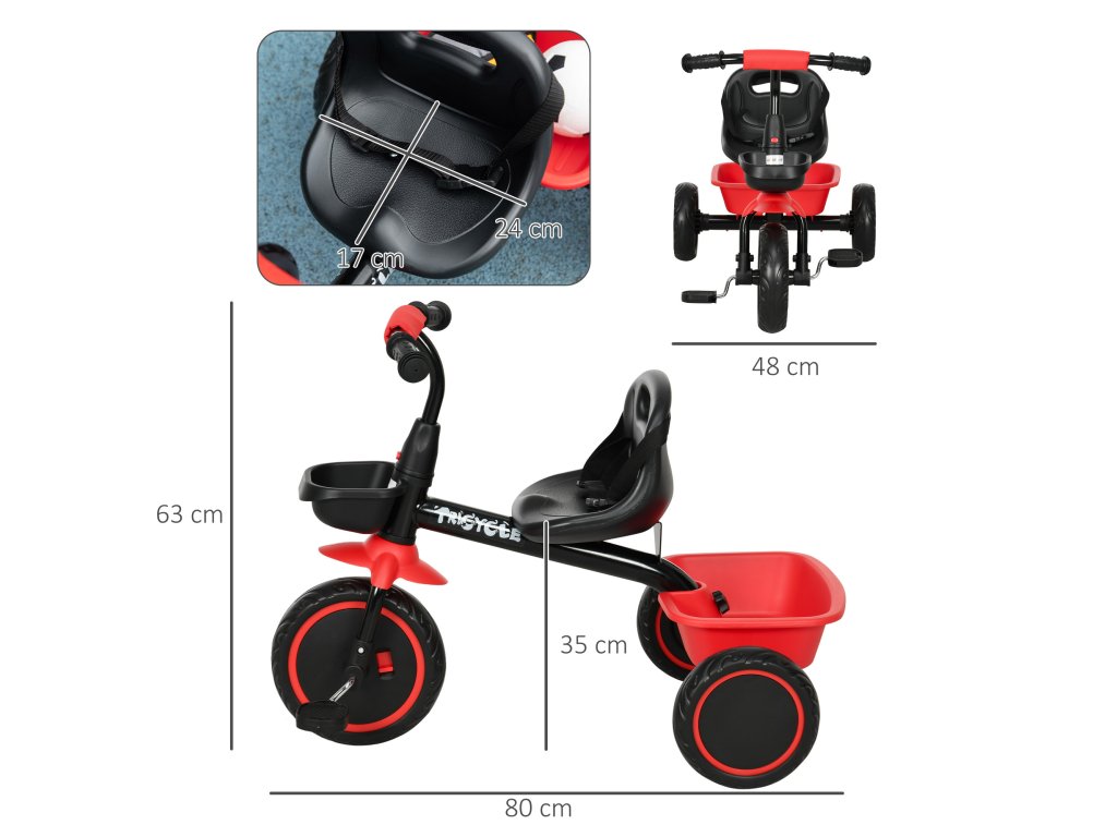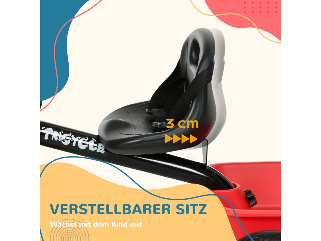 AIYAPLAY dětská tříkolka, dětská tříkolka s bederním pásem, 2 košíky, výškově nastavitelné sedadlo, kovový rám, pro děti od 2 do 5 let, černá+červená