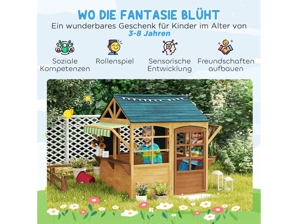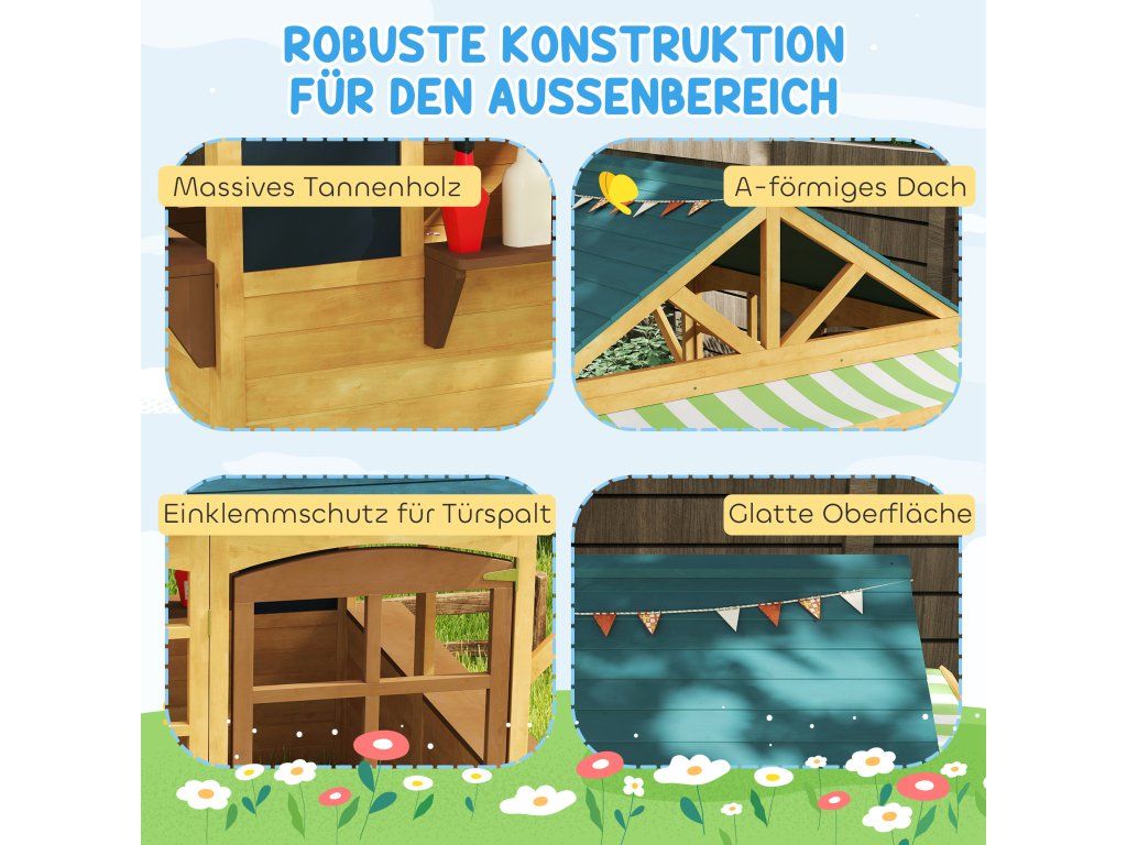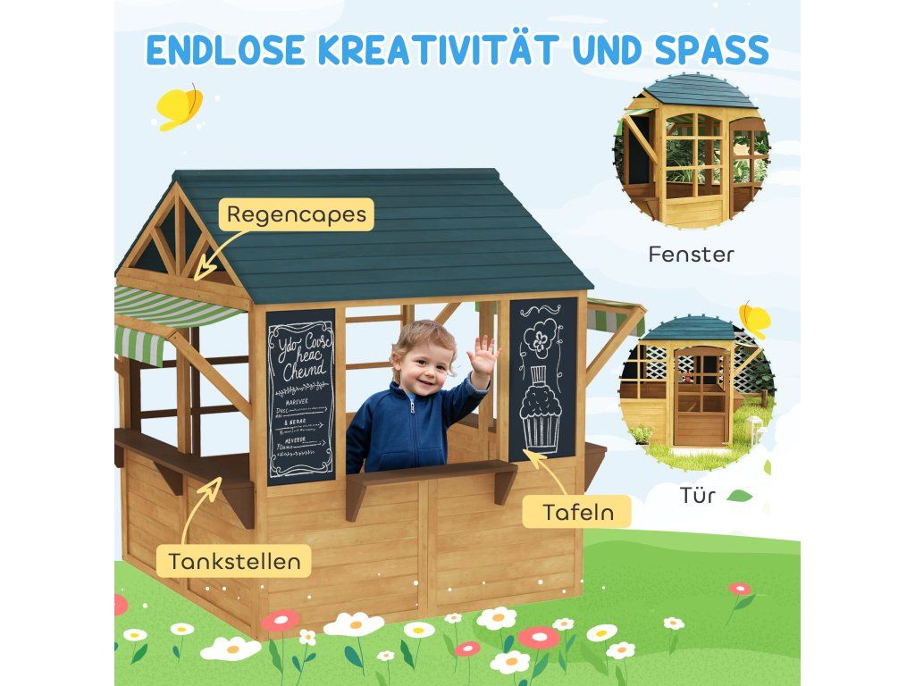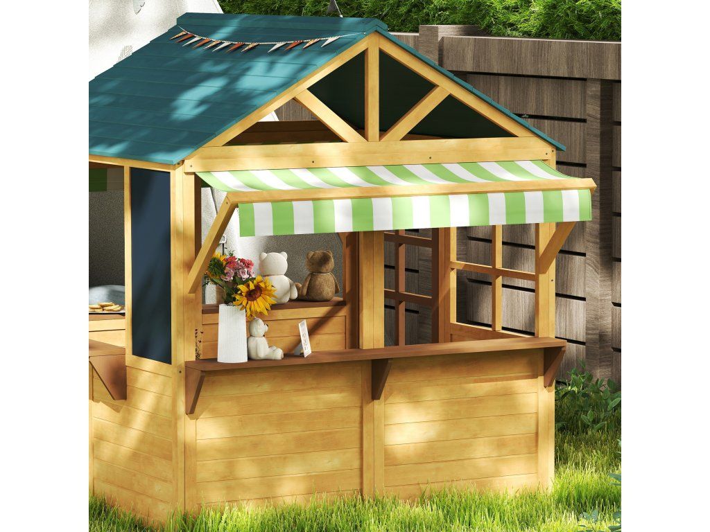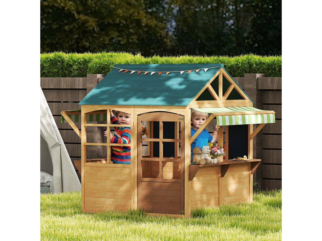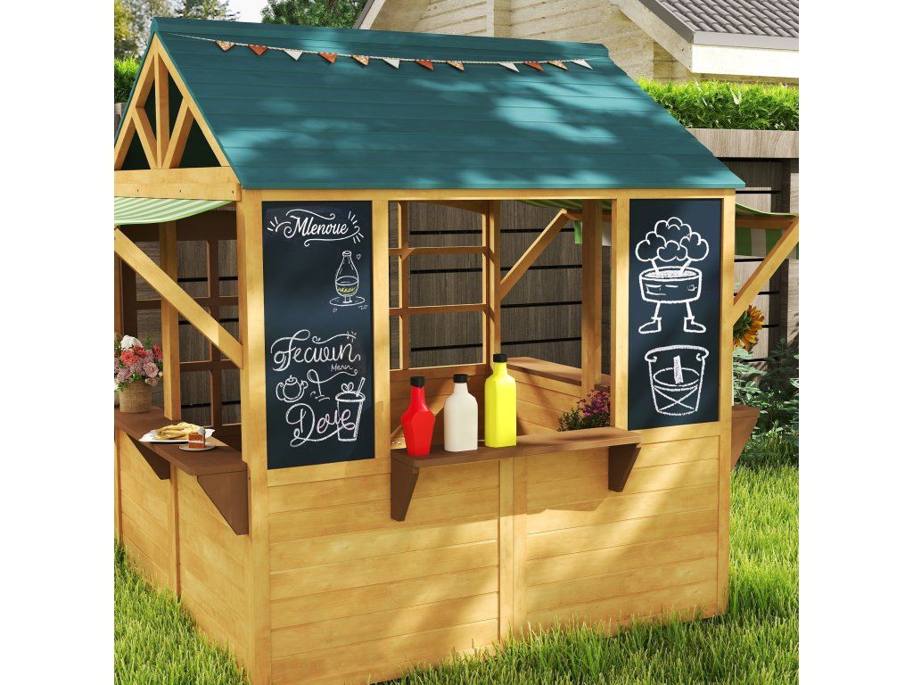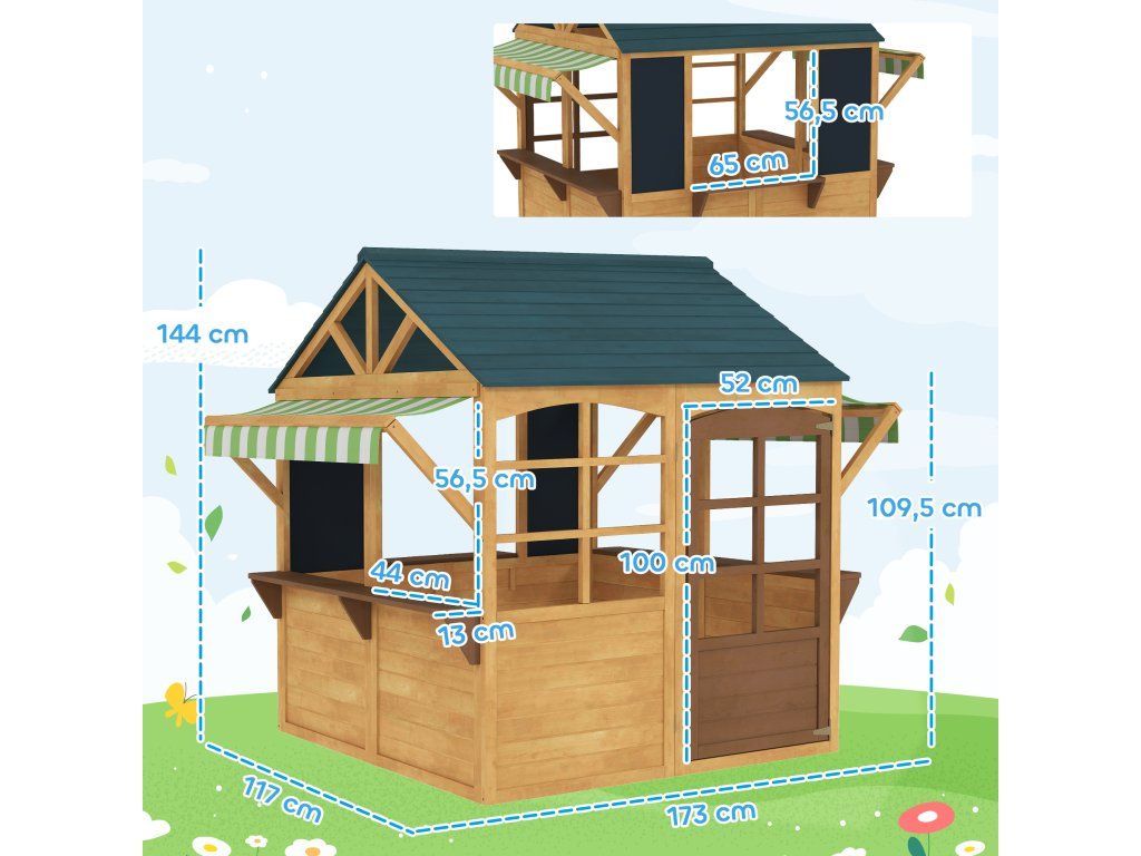 Tento dřevěný zahradní domek AIYAPLAY je ideální pro děti od 3 do 8 let. Díky pěti oknům nabízí cirkulaci čerstvého vzduchu a má ochranné krytky proti slunečnímu a UV záření. Dvě tabule s křídami podněcují kreativitu a parapet se stává zábavným obslužným pultem na svačinu. Vaše ratolesti zde mohou popustit uzdu své fantazii.