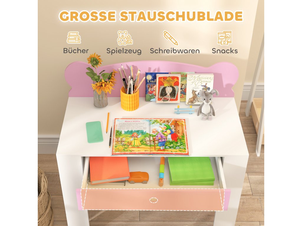 Se sadou dětského psacího stolu AIYAPLAY včetně židle zažijí vaše děti zvláštní zábavu při učení! Dětský psací stůl, který je ideální pro psaní, čtení, vybarvování a tvoření, nabízí dostatek pracovního prostoru a velkou zásuvku pro udržení pořádku. Roztomilé opěradlo školní lavice ve tvaru medvěda navíc dodá hravý nádech každému pokoji!