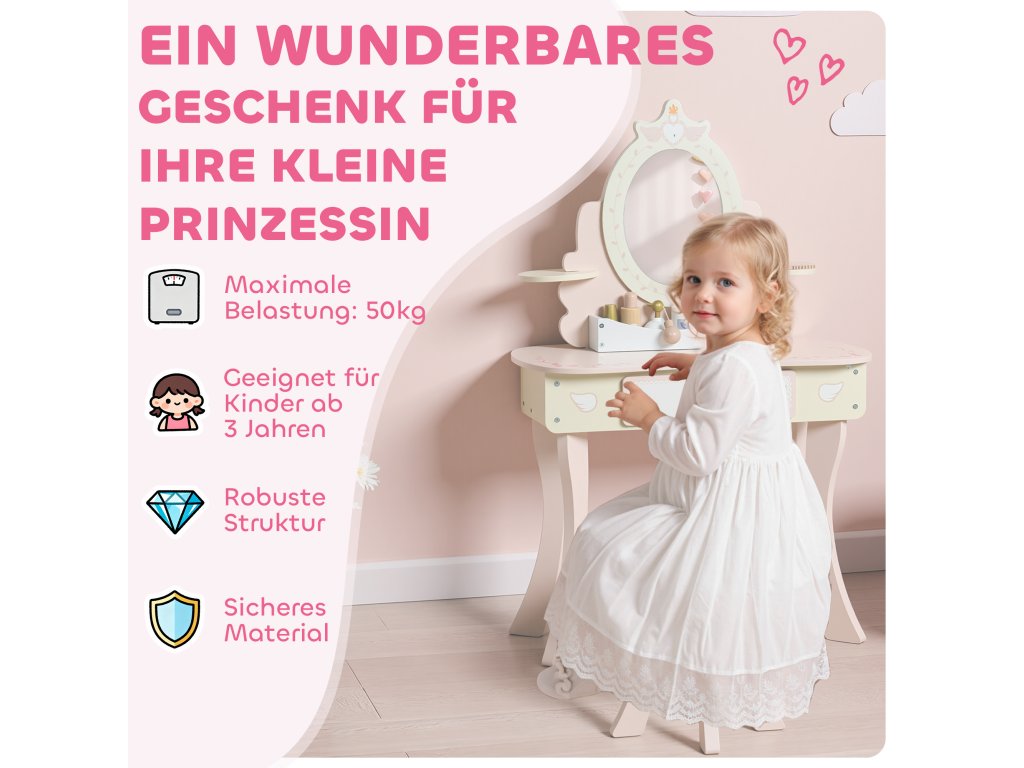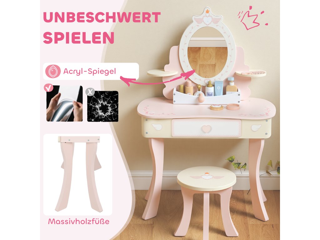 - Stabilita a bezpečnost: Vyroben z odolného MDF, buku a dřeva a vybaven nerozbitným akrylovým zrcadlem, tento toaletní stolek se stoličkou bezpečně unese až 50 kg a zajistí bezstarostnou hru