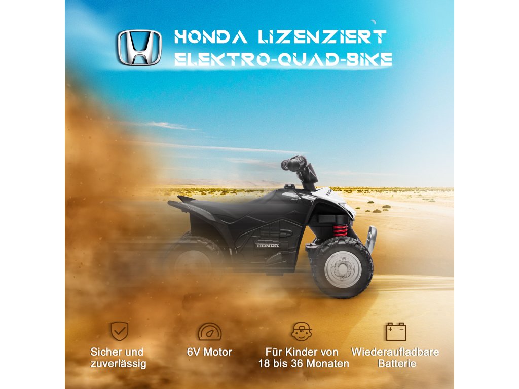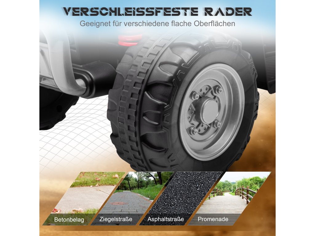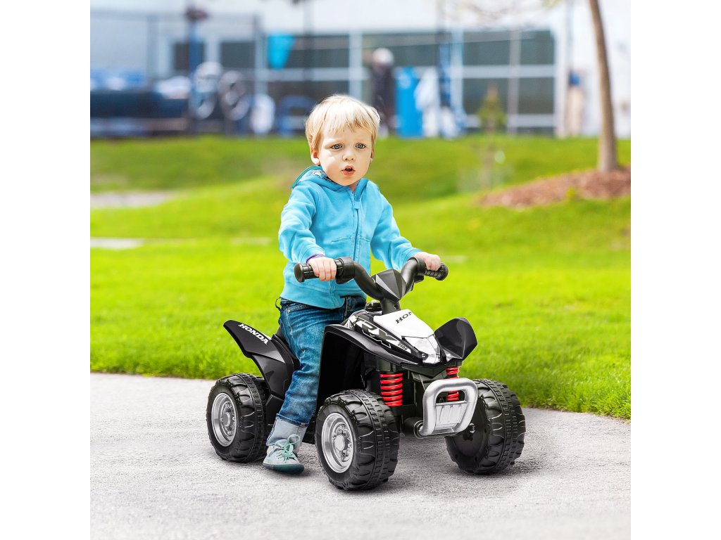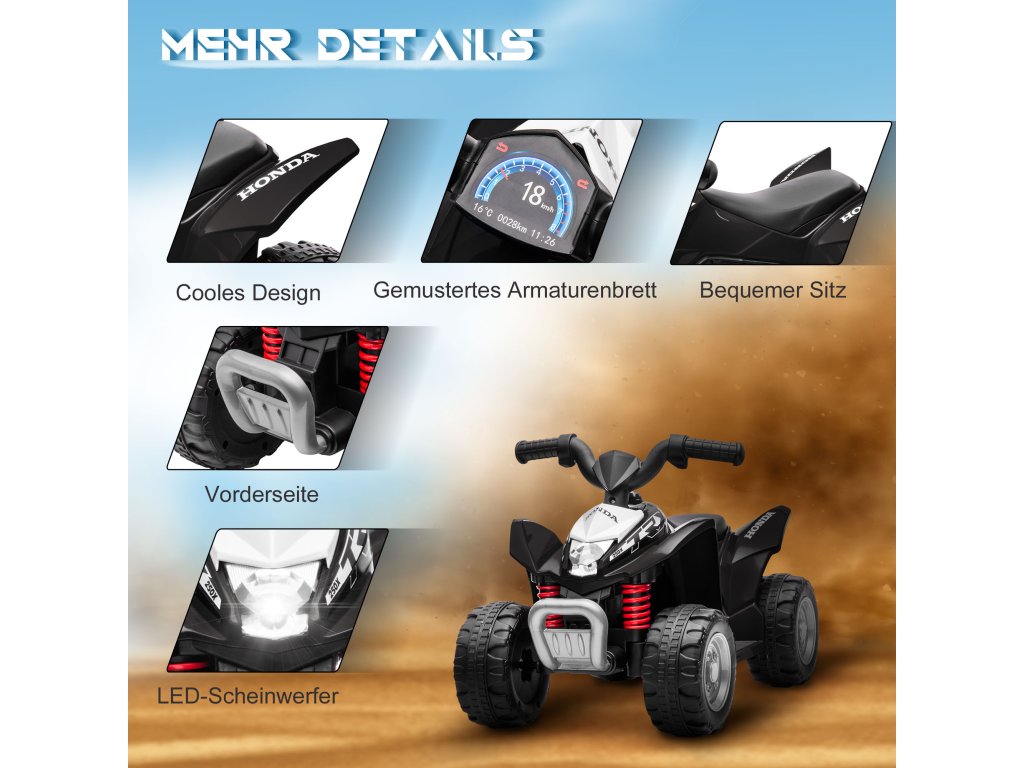 Bezpečné na silnici: Bezpečná maximální rychlost 2,8 km/h je ideální pro mladší děti. Čtyři široké pneumatiky s dezénem zajišťují plynulou jízdu na různých površích. Pohodlné sedadlo a protiskluzová řídítka chrání vaše dítě na čtyřkolce.