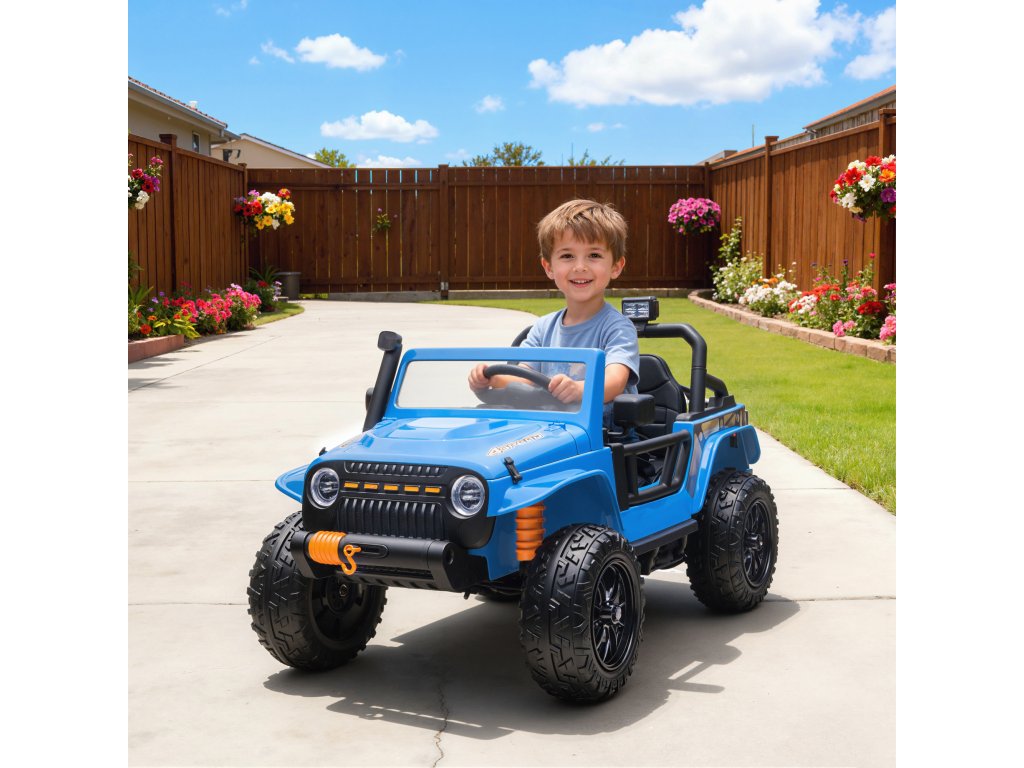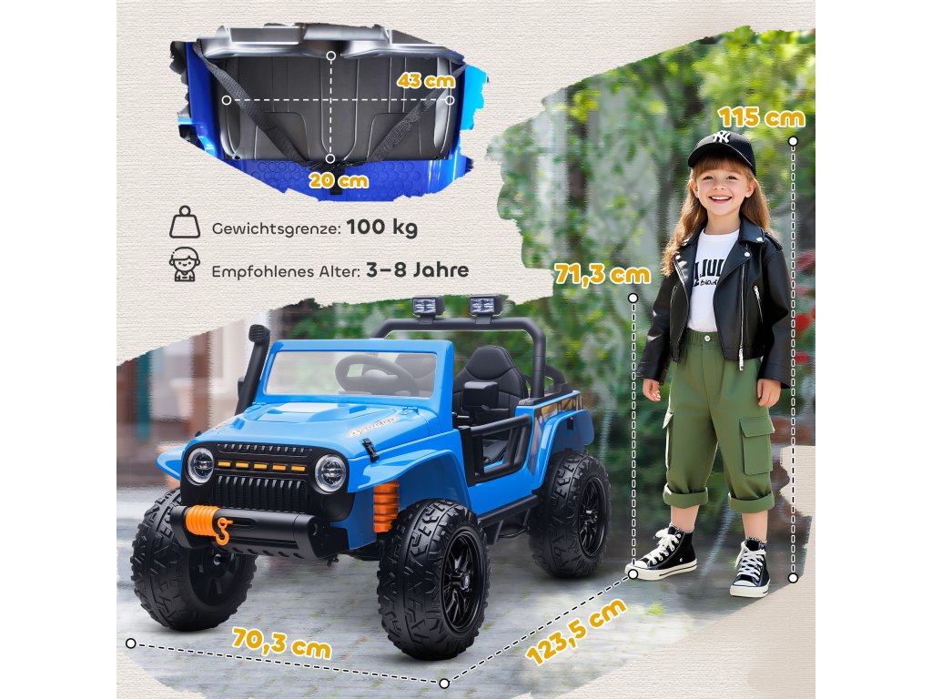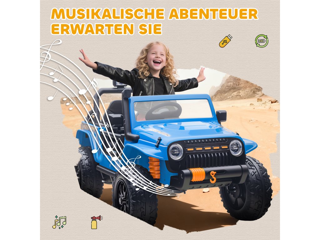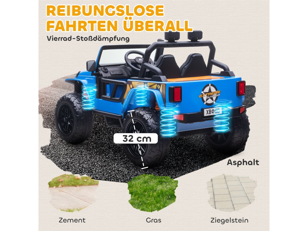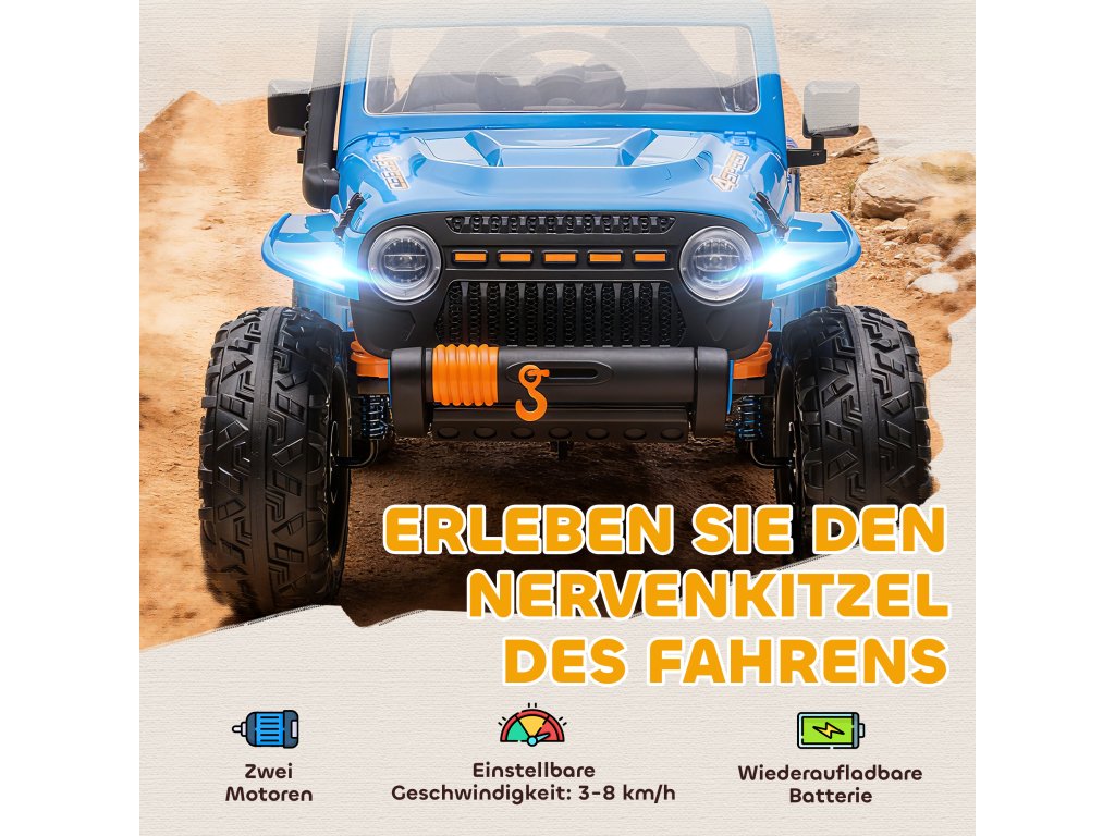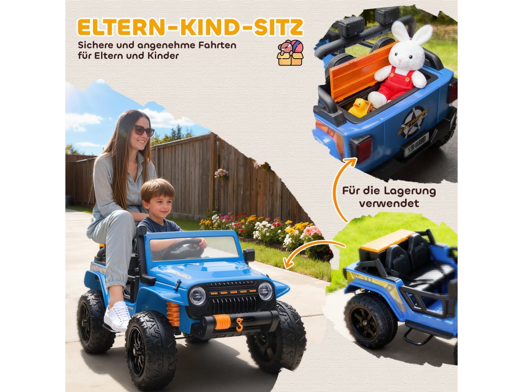 AIYAPLAY elektrická energie pro každého, baterie 12V, s rodič-dítě-sedátko, na dálkové ovládání, hudba, klakson, LED světla, 3-8 let, modré