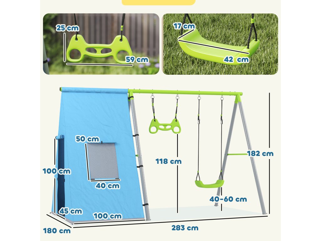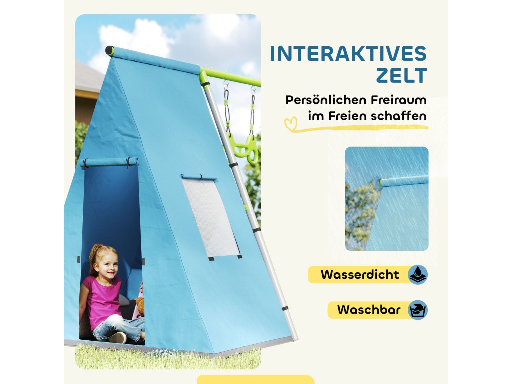 Proměňte svou zahradu v kouzelný ráj s dětskou houpačkou AIYAPLAY! Tato sada 3 v 1 potěší až čtyři děti ve věku 3-8 let houpacím sedátkem, gymnastickými kruhy a rozkošným stanem na hraní. Stabilní A-rám zajišťuje bezpečnost a nastavitelné lano proti zachycení chrání malé ruce. Vodotěsný stan je ideálním místem pro kreativní hru.