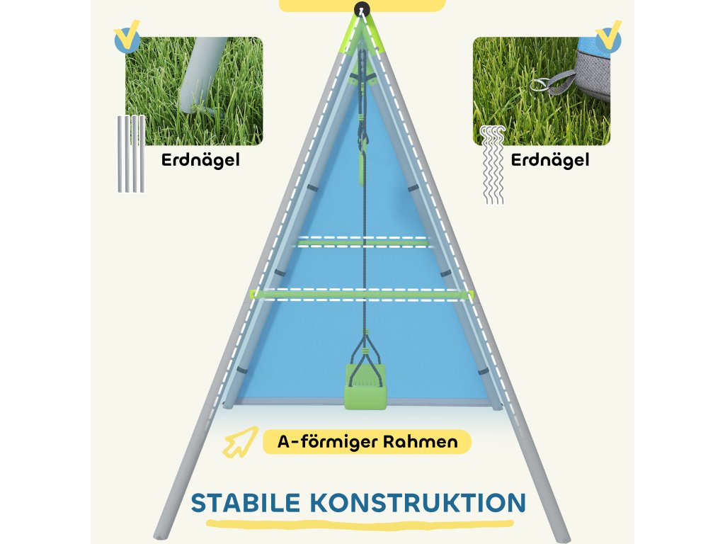 - ✔ Rám ve tvaru písmene A a zemní kotvy zajišťují stabilitu a bezpečnost