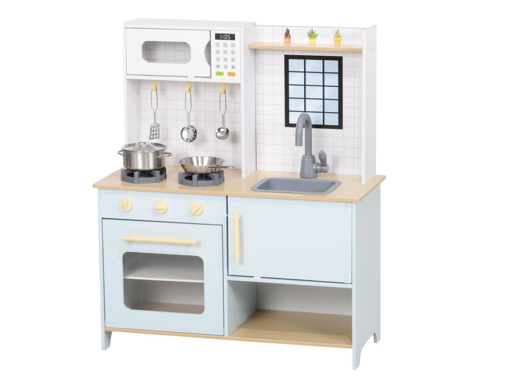 AIYAPLAY hrací kuchyňský set, dětská kuchyňka na hraní s mikrovlnnou troubou, vařičem a troubou, kuchyňské náčiní, MDF, nerezová ocel, modrá barva