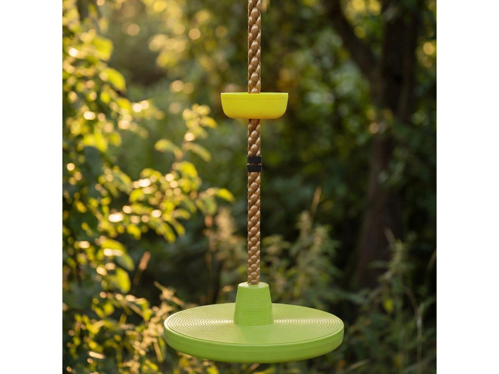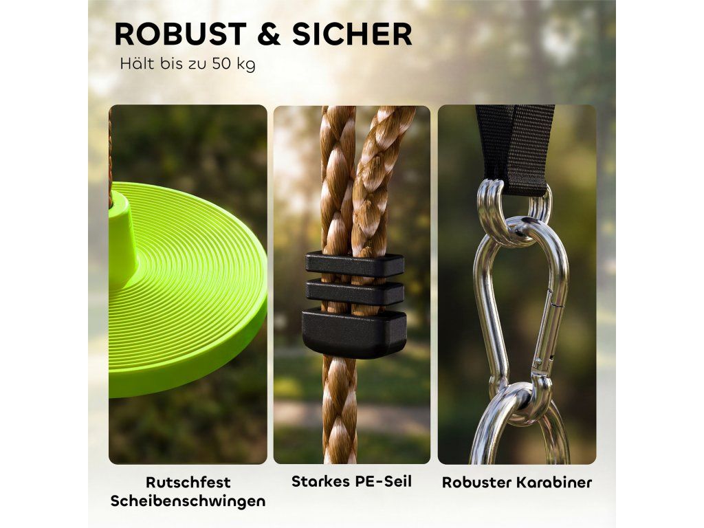 Robustní konstrukce: Kulatá houpačka o průměru 30 cm, čtyři lezecké stupačky o průměru 11 cm, odolné lano z HDPE a PE, nosnost až 50 kg, odolné a stabilní pro venkovní zábavu.
