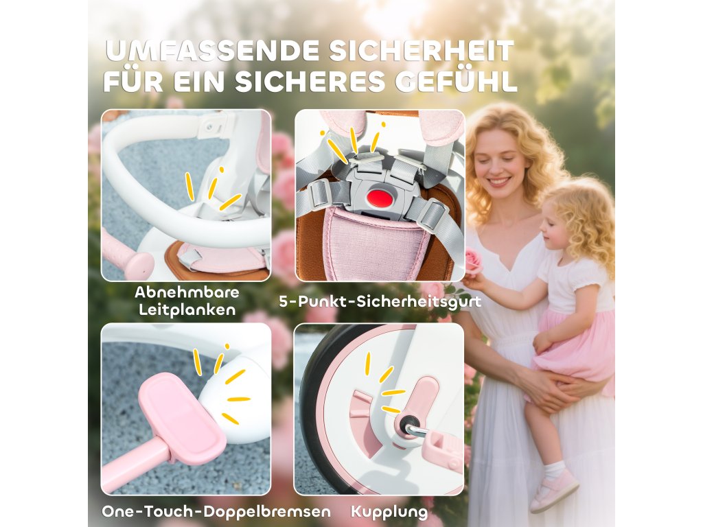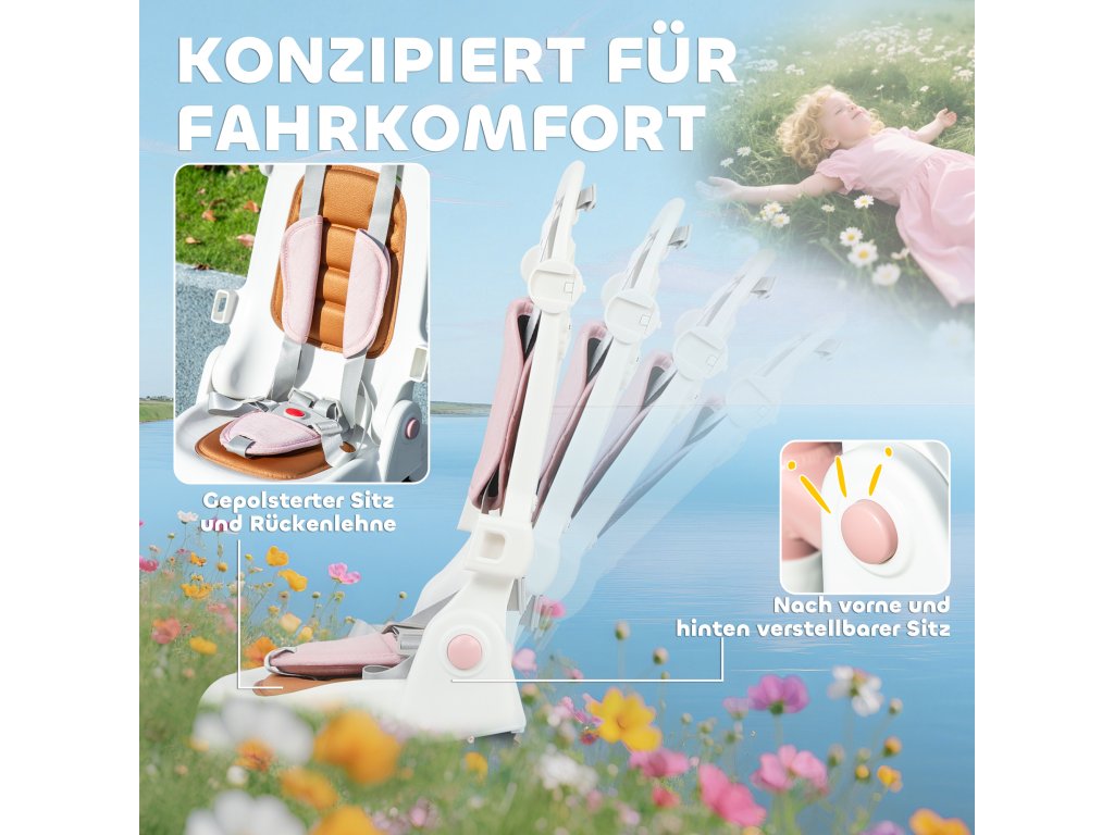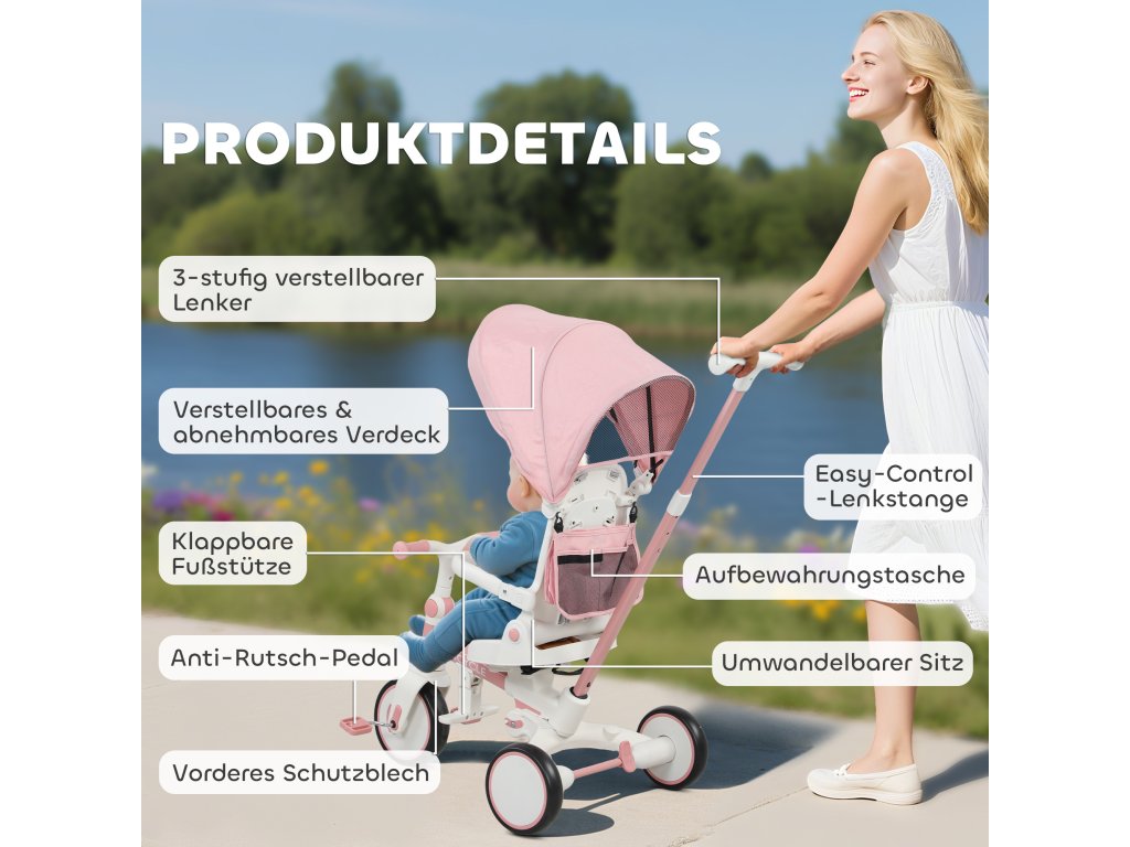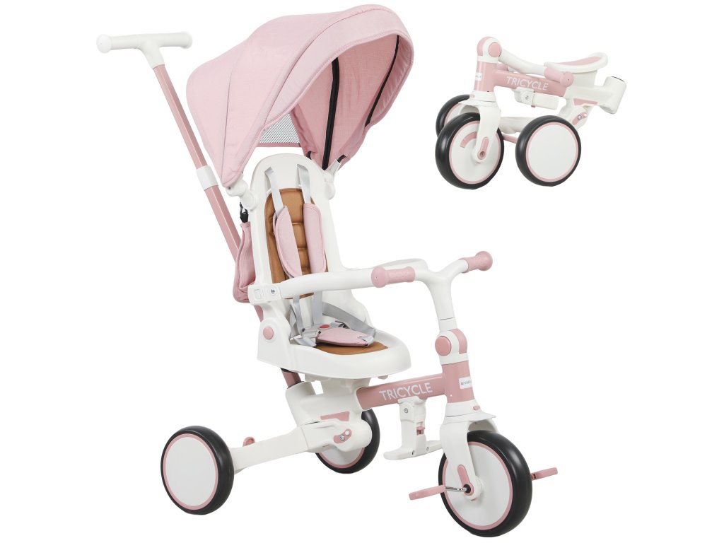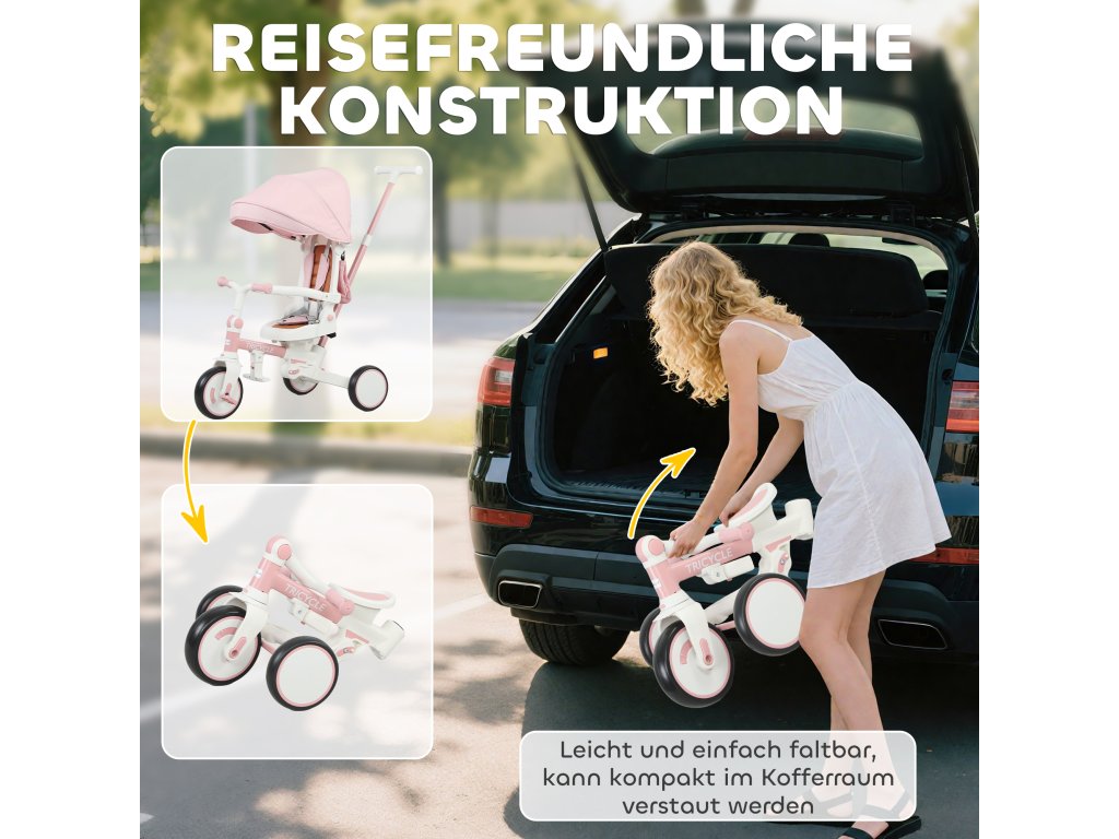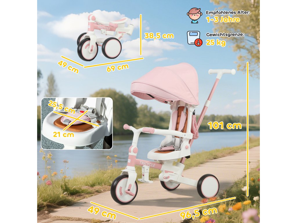 AIYAPLAY kočárek, dětská tříkolka, variabilní kočárek na batolata, provedení 5v1, odnímatelný vodicí rukojeť, nastavitelný, bezpečnostní pás, úložná taška, 1-3 let, růžová