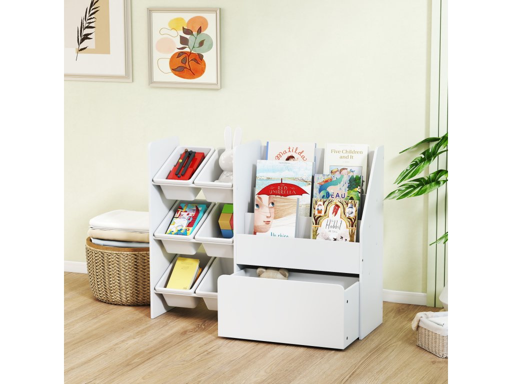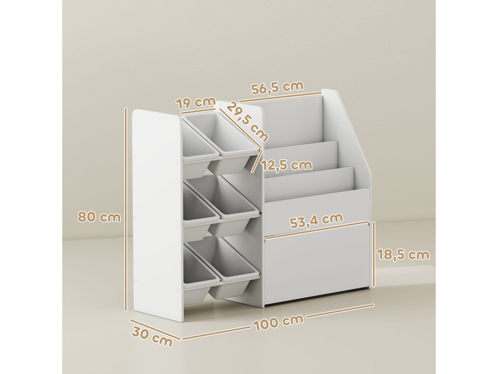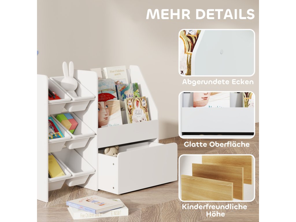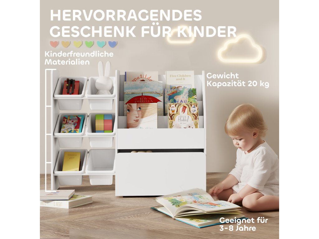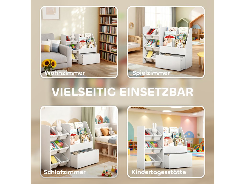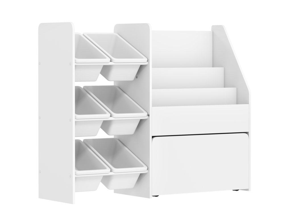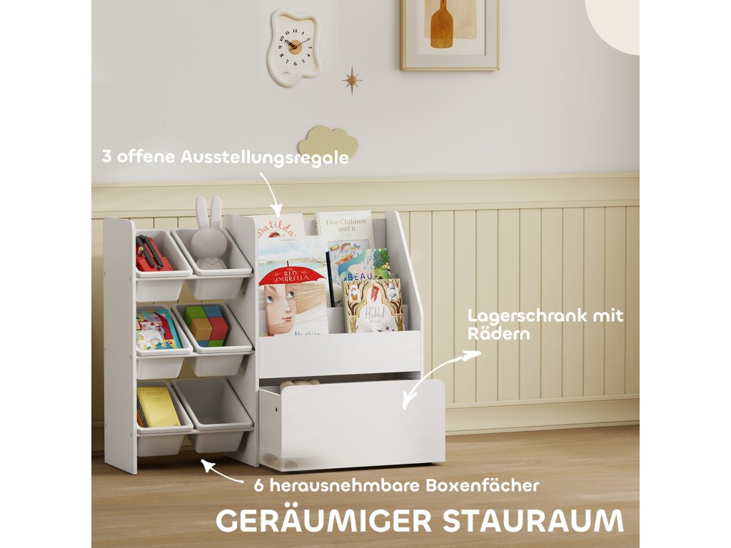 AIYAPLAY policie v řadě, policie do dětského pokoje s 6 úložnými boxy, policie v knihách, pojízdný box, 100 x 30 x 80 cm, MDF, ocel, bílé