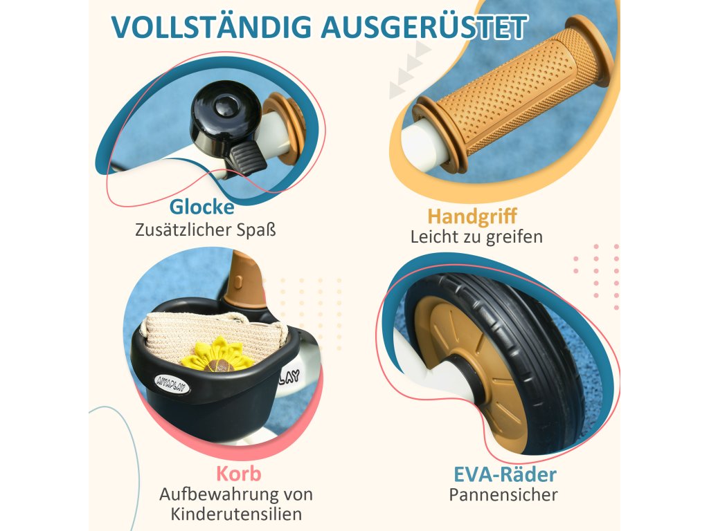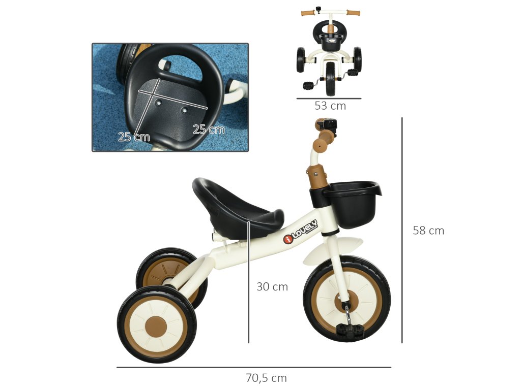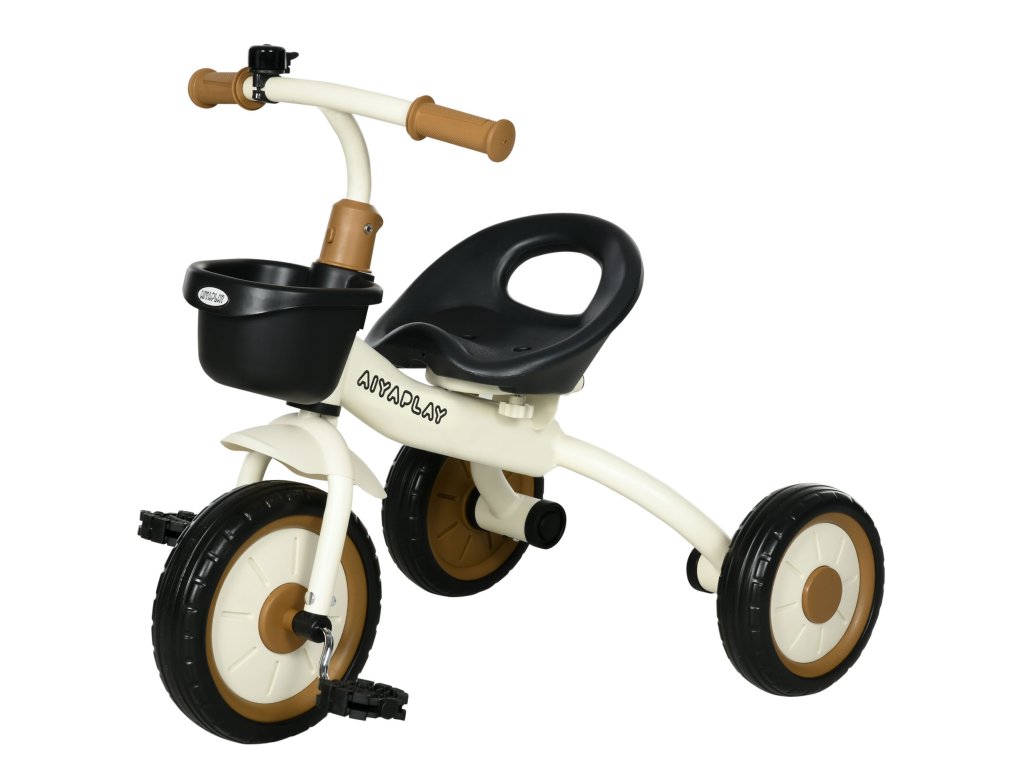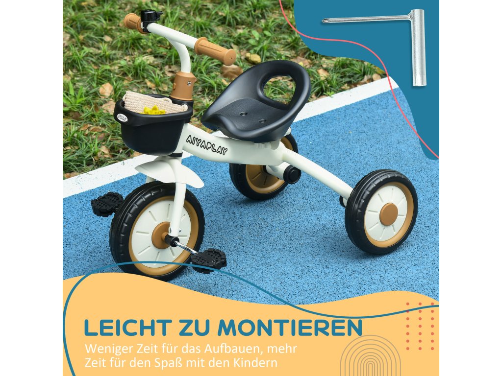 AIYAPLAY tříkolka pro dítě od 2 do 5 let, výškově nastavitelné sedadlo, zodek, košík na kolo, kovový rám, bílá barva