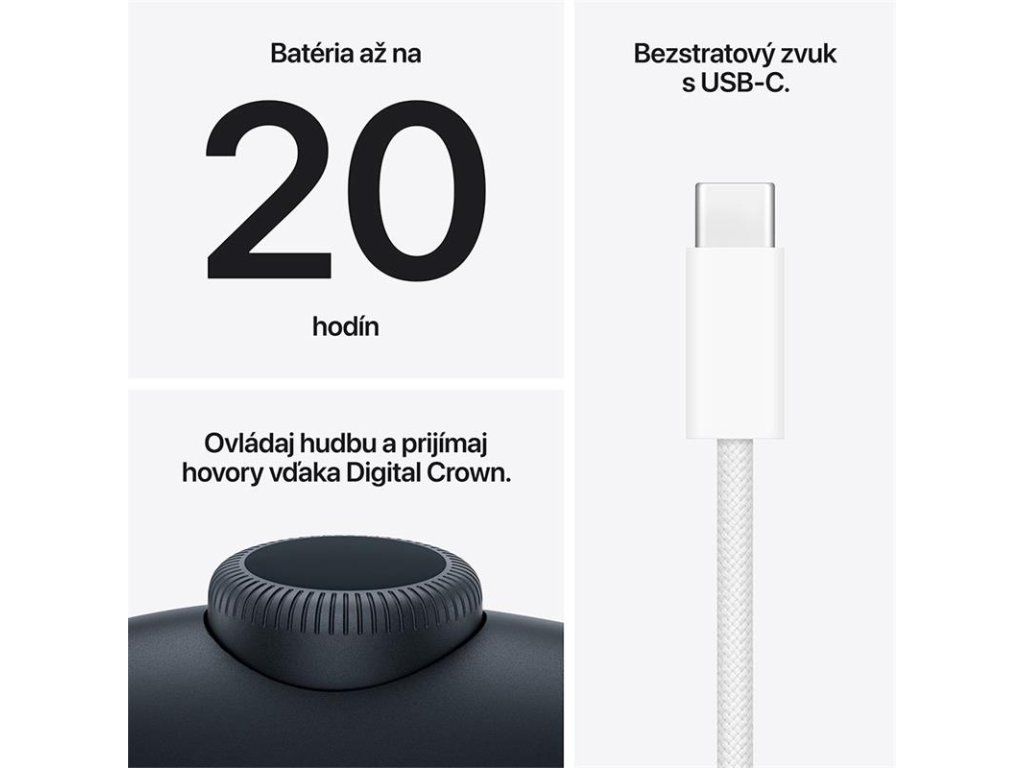Audio technologie-dynamický budič Apple pokrývá široký frekvenční rozsah a nechává vyznít jemné detaily každého tónu-speciální zesilovač s vysokým dynamickým rozsahem-aktivní potlačování hluku-adaptivní zvuk-režim propustnosti okolních zvuků-detekce konverzace-izolace hlasu-personalizovaný zvuk-tlust prostorový zvuk s dynamickým snímáním polohy hlavy-bezdrátový zvuk s mimořádně nízkou latencí přes USB-C Snímače-optický snímač (v obou sluchátkách)-snímač pozice (v obou sluchátkách)-snímač rozpoznání pouzdra (v obou sluchátkách)-akcelerometr (v obou sluchátkách)-gyroskop (levé sluchátko) MikrofonyPro potlačování nežádoucího vnějšího hlu mikrofonů:-osm mikrofonů pro aktivní potlačování hluku-tři mikrofony pro snímání hlasu (dva sdílené s aktivním potlačováním hluku a jeden samostatný) ČipSluchátkový čip Apple H2 (v obou sluchátkách) OvládáníKorunka Digital Crown-ovládání hlasitosti otáčením-jedním stisknutím zapneš/zastavíš přehrávání nebo přijmeš hovor-dvojím stisknutím ukončíš hovor nebo přeskočíš dopředu-trojitým stisknutím přeskočíš dozadu Tlačítko hlukového filtru-stisknutím propustnosti Baterie:AirPods Max 2-až 20 hodin poslechu na jedno nabití při zapnutém aktivním potlačování hluku nebo režimu propustnosti-až 20 hodin přehrávání filmů na jedno nabití se zapnutým prostorovým zvukem-až 20 hodin hovorů na jedno nabití-za 5 minut se nabijí zhruba na 1,5 hodiny poslechu sluchátka v ultra úsporném režimu, ve kterém si baterie zachovává úroveň nabití. Nabíjení přes USB-C PřipojeníBluetooth 5.3 Zpřístupnění:Funkce zpřístupnění pomáhá lidem s postižením dostat z nových AirPodů Max co nejvíce. Dostupné funkce zpřístupnění:-živý poslech-hlasitost zvuku ve sluchátkách-přizpůsobení pro sluchátka Požadavky:-modely iPhone s nejnovější verzí iOS-modely iPadu s nejnovější verzí iPadOS-modely Apple Watch s nejnovější verzí watchOS-modely Macu s nejnovější verzí MacOS-modely Apple TV s nejnovější verzí tvOS Životní prostředí:Při hodnocení vlivu na životní prostředí bere Apple v úvahu celý životní cyklus produktu.-neobsahují bromované zpomalovače hoření-neobsahují PVC-neobsahují berylium Balení obsahuje:-AirPods Max 2-Smart Case-USB-C kabel-dokumentace Rozměry:168,6 x 187,3 x 83,4 mm Hmotnost: (sluchátka)386,2 g Hmotnost: (Smart Case)134,5 gDoplňkové parametry