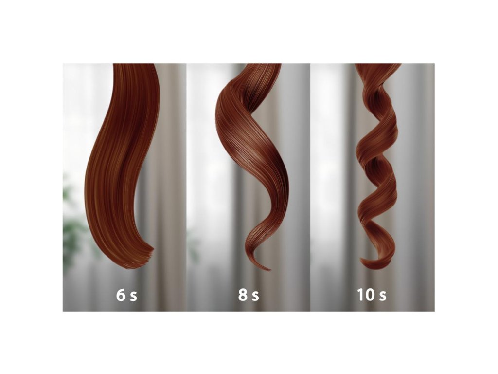 Kombinace 18 možností stylingu – 3 nastavení času (6 s, 8 s, 10 s), 3 nastavení teploty (160 °C, 180 °C, 200 °C) a 2 nastavení rotace (vlevo, vpravo)
