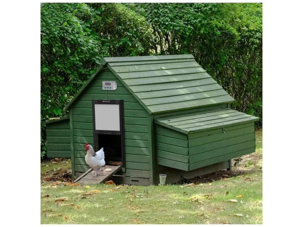Zařízení pro otevírání/zavírání kurníku je osazeno v odolném plastovém pouzdru. Dvířka jsou zvedána pomocí motorku, který zvládne zvednout dvířka až o hmotnosti 2 kg. Dvířka nejsou součástí balení, je možno je zakoupit buď zvlášť nebo jako SET s jednotkou, případně můžete použít jakákoli stávající vertikálně otevíraná dvířka.