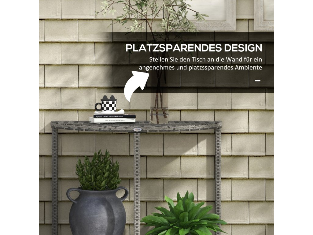 - Odolný vůči povětrnostním vlivům: Tento půlkruhový polyratanový stolek můžete umístit ke stěně, abyste ušetřili místo. Díky vysoké odolnosti proti povětrnostním vlivům je ideální jako balkonový stolek nebo na zahradu a terasu.