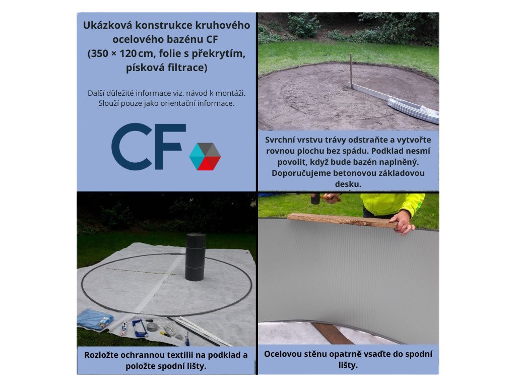 Montáž probíhá pomocí spodních a horních lišt, do kterých se zasazuje ocelová stěna. Spojení stěny šrouby vytváří pevný kruh a zavěšená fólie se překlápí přes horní hranu. Konstrukce je navržena tak, aby byla montáž zvládnutelná svépomocí při dodržení montážního návodu.