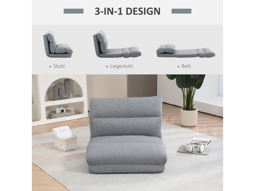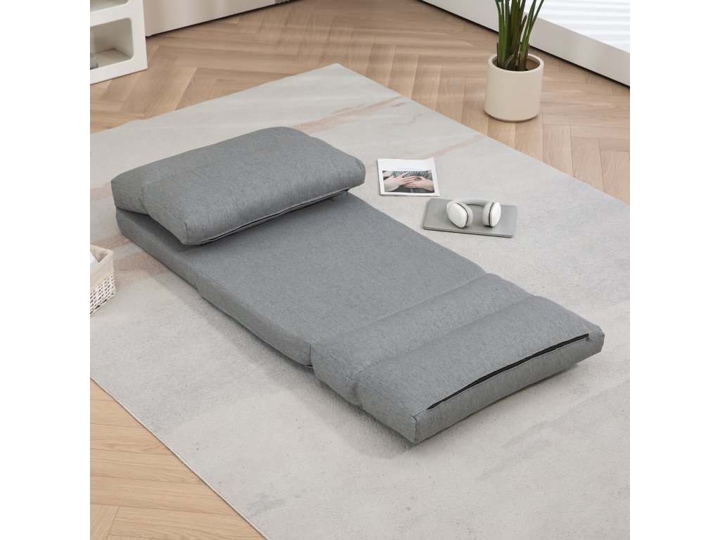 - Trojí skládání: Tuto podlahovou pohovku lze po úplném složení uložit ve svislé poloze do stísněných prostor, což představuje praktické řešení pro sezení v menších obytných prostorech