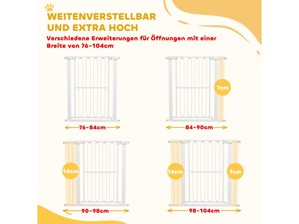- Nastavitelné uložení: Tato bezpečnostní branka do dveří je nastavitelná na šířku od 76 do 104 cm a na výšku 94 cm, což je ideální pro průchody různých šířek a pro spolehlivé zajištění vašeho domácího mazlíčka