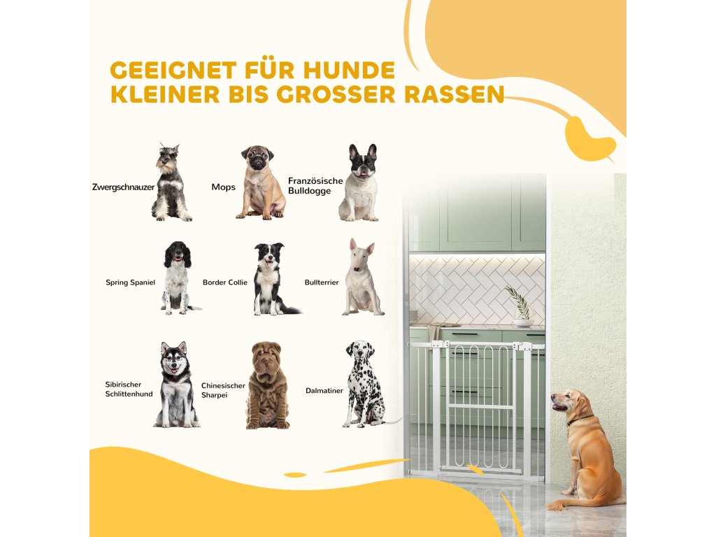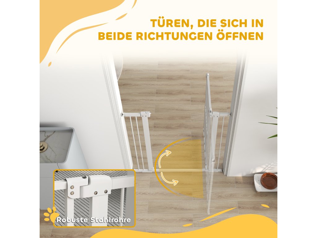 Udržujte svého čtyřnohého přítele v bezpečí a optimalizujte svůj domov pomocí dveřní brány PawHut bez vrtání. Tato branka je nastavitelná od 76 do 104 cm a je ideální pro schody, chodby a dveře. Dvojité zamykání schodišťové branky umožňuje snadné otevírání jednou rukou a zajišťuje bezpečnost, protože se branka kýve na obě strany. Je vhodná pro malé i velké psy a dokonale ladí s vaším nábytkem.