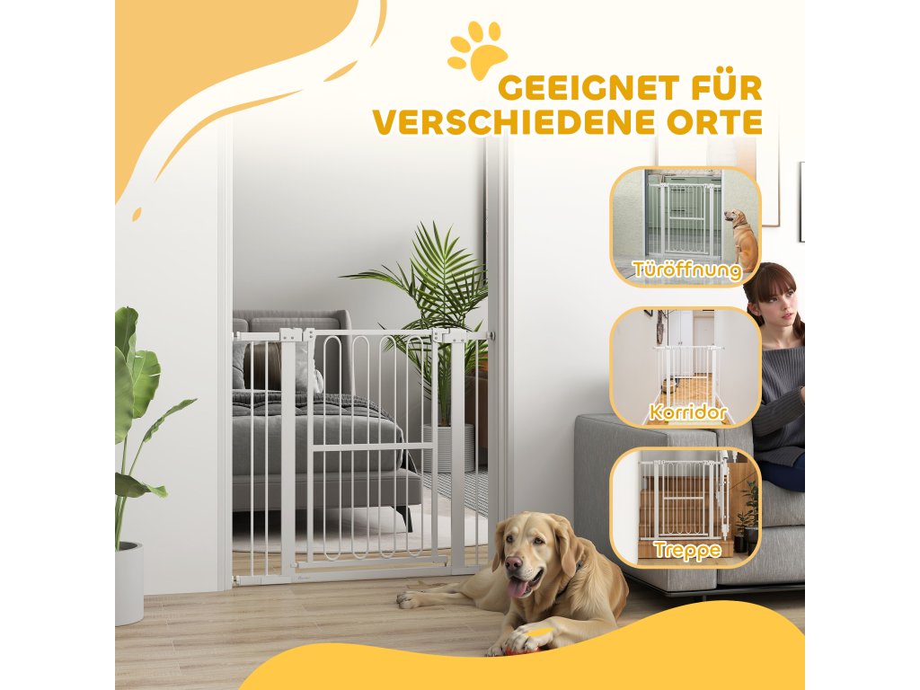 - Elegantní design: Díky elegantnímu bílému laku se tato branka do dveří pro psy dokonale hodí ke schodům, chodbám nebo dveřím a ideálně ladí s designem vašeho interiéru