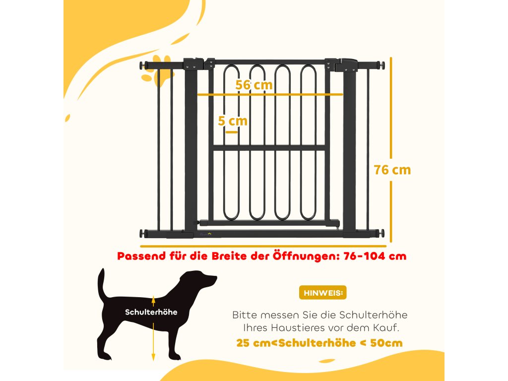 - Nastavitelné uložení: Tato bezpečnostní branka do dveří je nastavitelná na šířku od 76 do 104 cm a na výšku 76 cm, což je ideální pro průchody různých šířek a pro spolehlivé zajištění vašeho domácího mazlíčka
