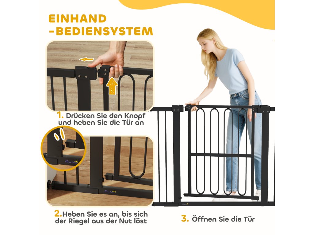 - ✔ Ovládání jednou rukou a dvojitá bezpečnostní pojistka schodišťové branky pro bezpečný a snadný přístup
