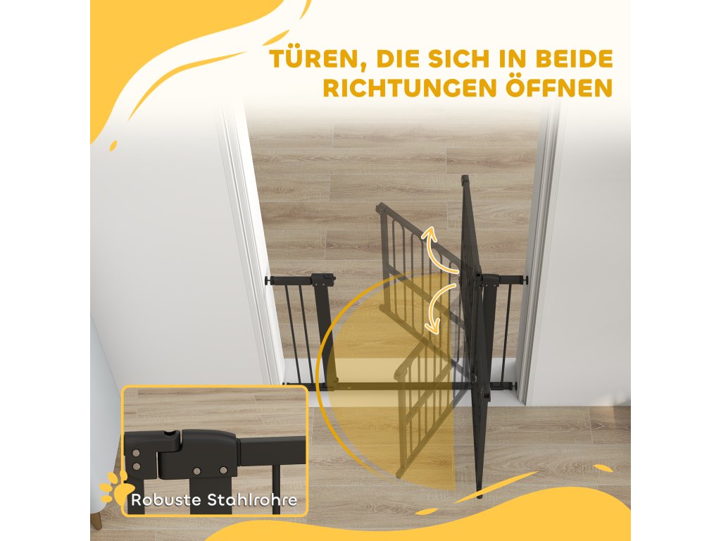 Udržujte svého čtyřnohého přítele v bezpečí a optimalizujte svůj domov pomocí dveřní brány PawHut bez vrtání. Tato branka je nastavitelná od 76 do 104 cm a je ideální pro schody, chodby a dveře. Dvojité zamykání schodišťové branky umožňuje snadné otevírání jednou rukou a zajišťuje bezpečnost, protože branka se otáčí na obě strany. Je vhodná pro malé i velké psy a dokonale ladí s vaším nábytkem.