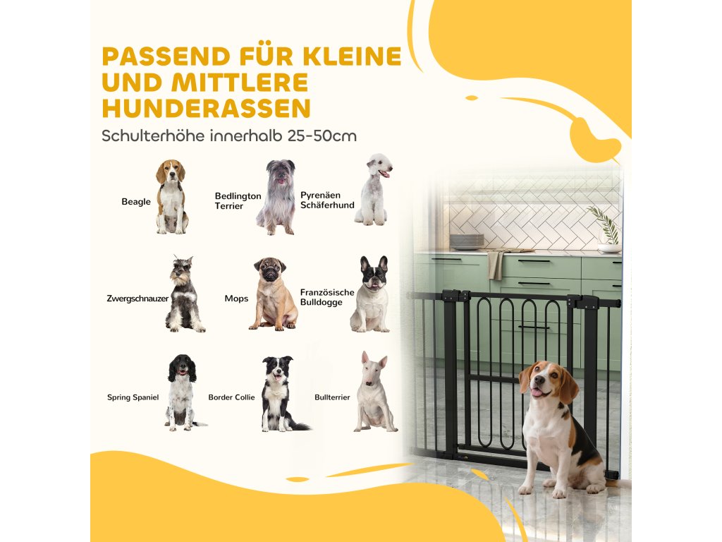 - Robustní konstrukce: Tato schodišťová branka bez vrtání je vyrobena z odolného kovu a plastu, vydrží interakci se psy a je vhodná pro plemena psů různých velikostí s výškou ramen 25 až 50 cm