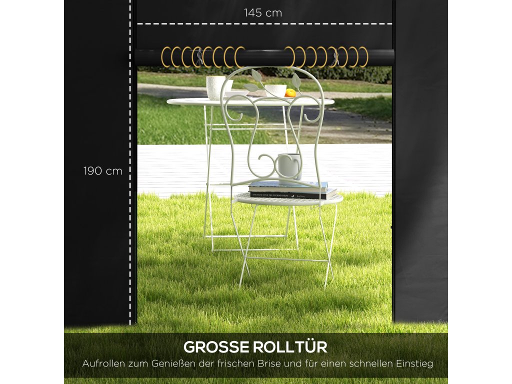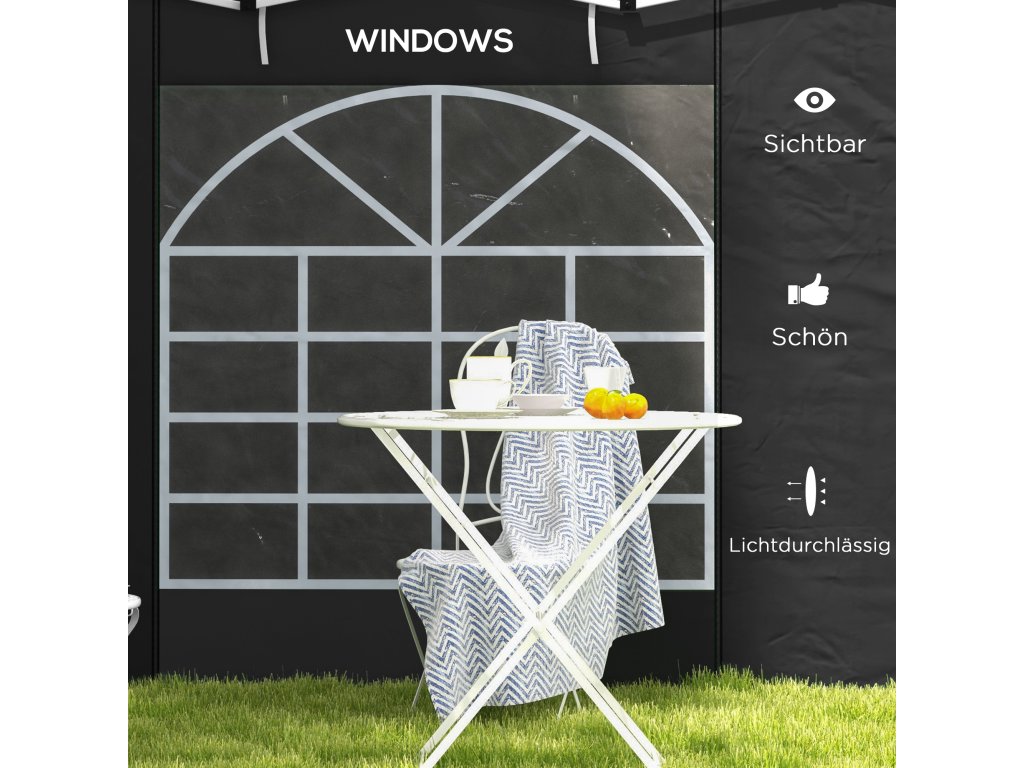 - Dvouvrstvá okna: Sklopné boční stěny altánu propouštějí světlo a umožňují jasný výhled ven