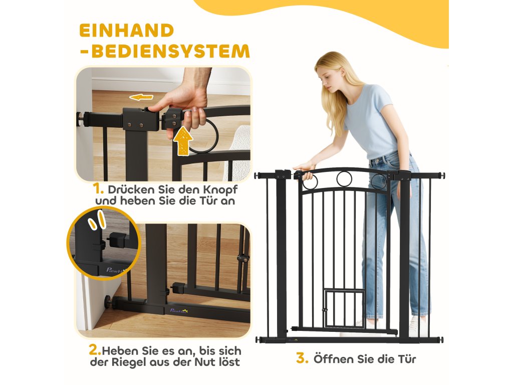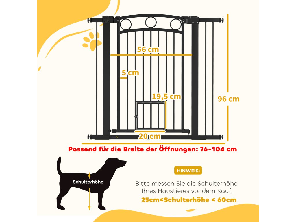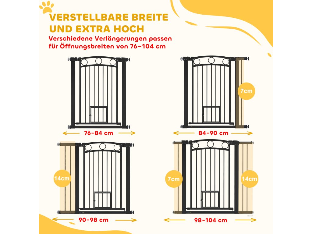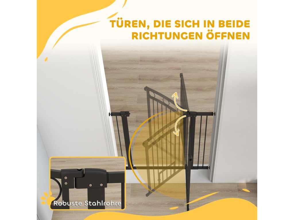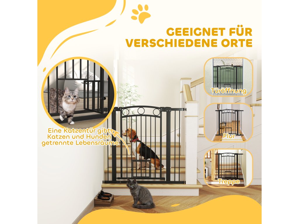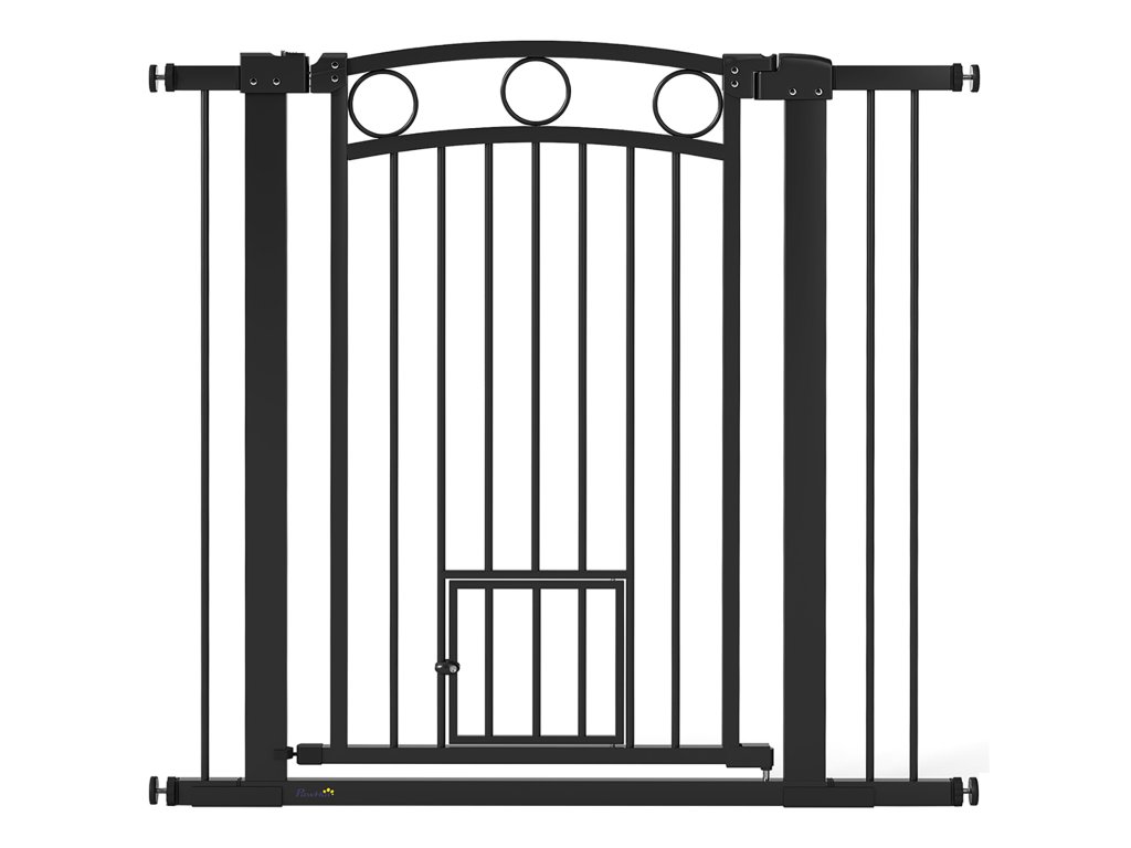 Brána pro zvířata PawHut, 96 cm, nastavitelná šířka 76-104 cm, s dvířky pro kočky, pro schody a dveře, černá