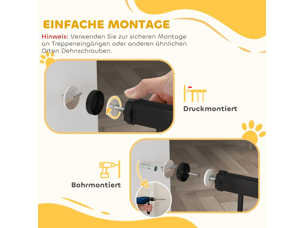 - Snadné možnosti instalace: Dveřní branku lze namontovat buď tlakem, aby se zabránilo poškození, nebo ji lze navrtat do zdi pro pevnější řešení, v závislosti na vašich individuálních požadavcích