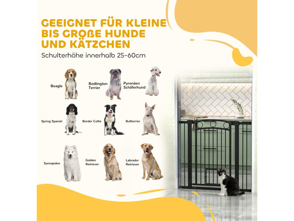 - Vhodné pro domácí zvířata: S integrovanými dvířky pro kočky je ideální pro domácnosti s kočkami a psy. Elegantní design dveřní bezpečnostní branky se dokonale hodí k jakémukoli schodišti, chodbě nebo dekoraci dveří.
