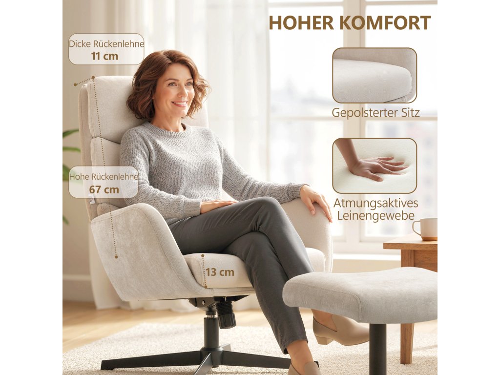 Prodyšné pohodlí: Ponořte se do 13 cm silného polstrovaného sedáku a 11 cm silného opěradla s dvouvrstvou konstrukcí. Toto křeslo je čalouněno prodyšnou látkou s imitací lnu a zaručuje celoroční pohodlí – ideální pro čtení, sledování televize nebo relaxaci po dlouhém dni.