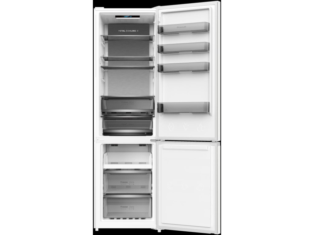 S celkovým objemem 405 litrů, z toho 285 litrů v chladicí části a 120 litrů v mrazicí části, nabízí Brandt BFC2066AW dostatek prostoru pro veškeré vaše potraviny. Chladicí část obsahuje Fresh zónu pro čerstvé potraviny, tři police z bezpečnostního skla a dvě zásuvky na ovoce a zeleninu. Mrazicí část je vybavena třemi objemnými šuplíky a formou na ledové kostky.