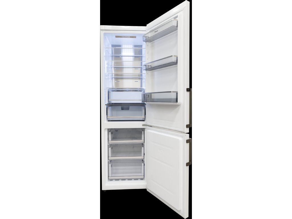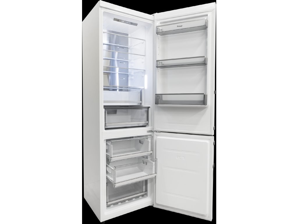 Volně stojící kombinovaná chladnička No Frost v bílém barevné provedení; Dotykový displej na dveřích chladničky vám umožní snadno nastavit teplotu a ovládat doplňkové funkce chladničky; Zásuvka na ovoce a zeleninu; Vertikální madlo na dveřích; Metal Cooling - zadní nerezová stěna uvnitř chladničky; Možnost změny směru otevírání dveří; Funkce: Rychlé chlazení, Rychlé mrazení, Prázdniny, SabbathMode, EnergySaving; Akustický alarm dveří; Demo režim; Akumulační doba (výdrž bez proudu): 11 hod.; Energetická třída D; Roční spotřeba energie: 207 kWh; Hlučnost 37 dB(A); Celkový objem 346 l; Rozměry (VxŠxH): 201 x 59,5 x 65 cm.