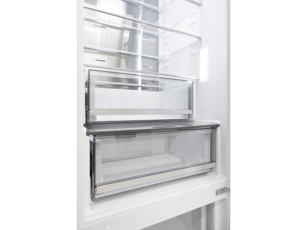 Chladící část: Objem 246 l z toto zchlazovací zásuvka 31 l; Systém No Frost; Automatické odmrazování; Funkce: Rychlé chlazení, Prázdniny, SabbathMode, EnergySaving; Nastavení teplot chladničky: 2~8 °C, nízkoteplotní zóny: -1~3 °C; Vnitřní LED osvětlení; 4 výškově nastavitelné + 1 pevná police z bezpečnostního skla; Zásuvka na ovoce a zeleninu + zchlazovací zásuvka; 3 standardní příhrádky a 1 hluboká závěsná přihrádka ve dveřích na lahve; Držák na vajíčka.