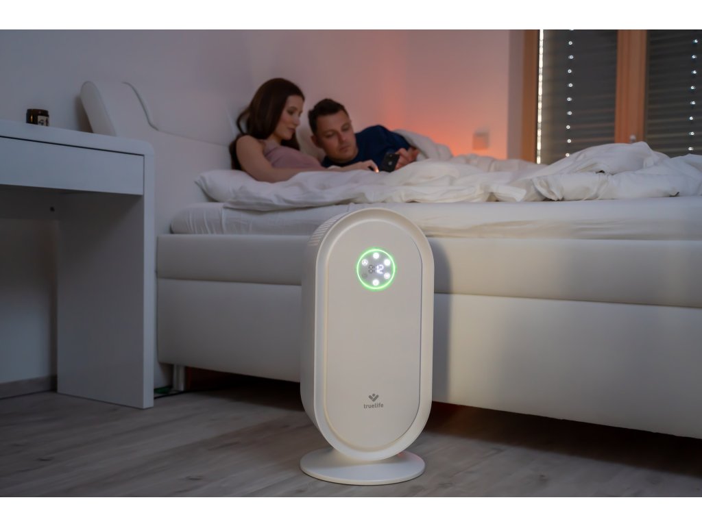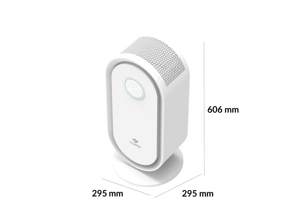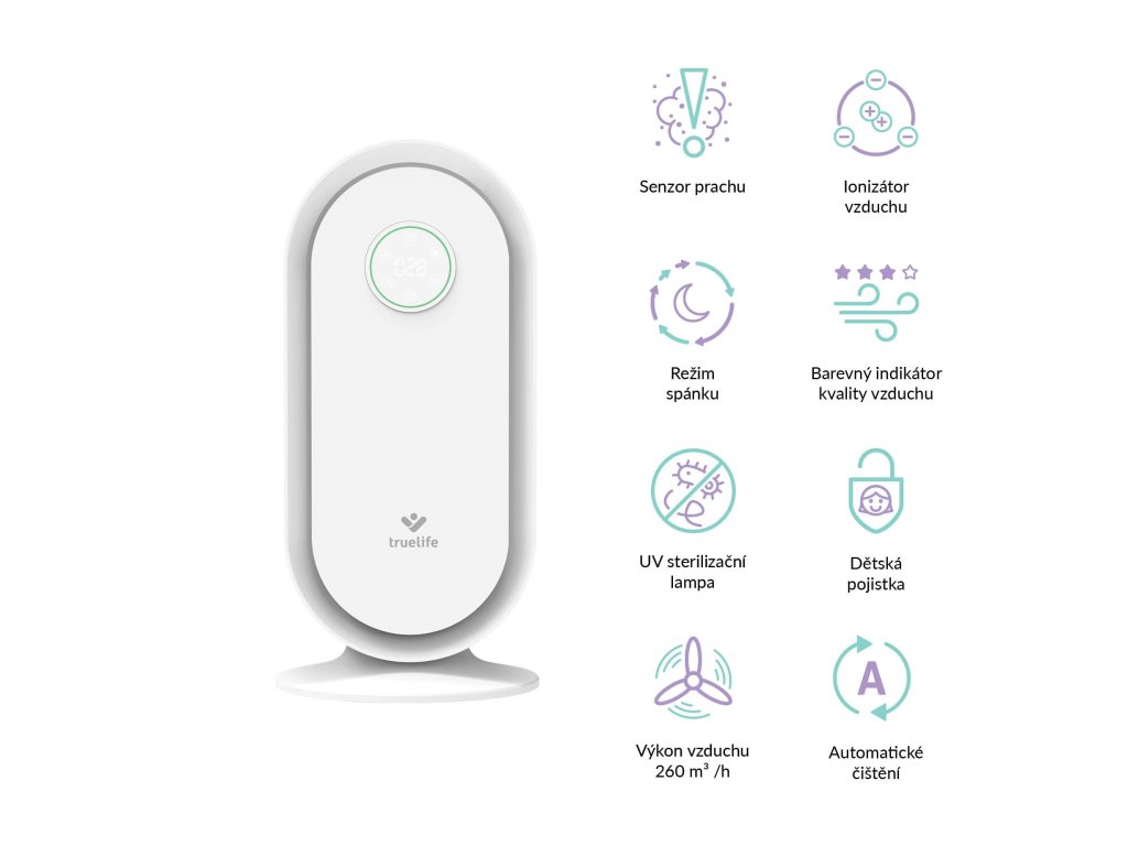 Čistička vzduchu TrueLife vyčistí až 260 m3 vzduchu za hodinu. Je vhodná do místnosti o velikosti 25-30 m2 a díky nízké hmotnosti jí můžete bez obav přenášet. Čistička celkově zlepšuje kvalitu vzduchu, ničí viry, bakterie a další nečistoty a může tak významně pomoci alergikům nebo astmatikům. Čistička je opatřena barevnými indikátory kvality vzduchu, funkcí automatické detekce nečistot a automatického čištění. Bydlíte-li na místě, kde se často práší, potěší vás přítomnost prachového senzoru. 6 násobná filtrace v podobě anti-bakteriálního filtru, HEPA filtru, uhlíkového filtru, katalytického filtru, UV světla a ionizace zachytí až 99,9% polétavého prachu a vyčistí 93,5 % těkavých organických látek. Zároveň zachycuje i viry a koronaviry.
