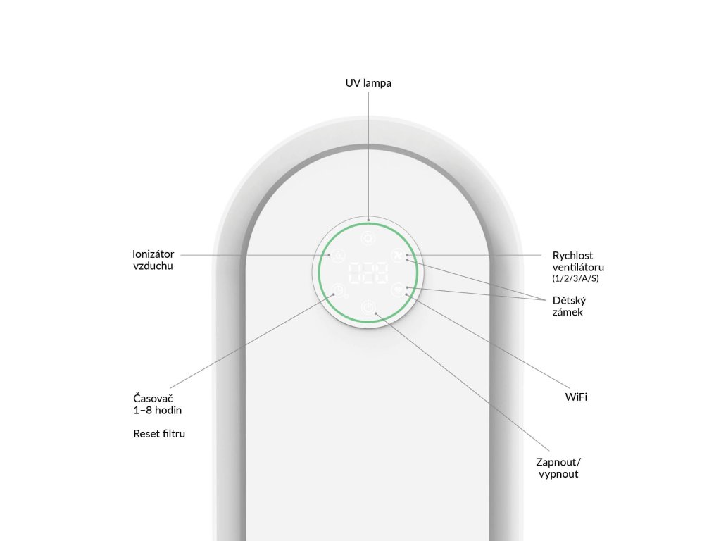 Ovládání čističky vzduchu je velmi jednoduché a intuitivní. Všechny funkce lze nastavit pomocí ikon na dotykovém displeji.
