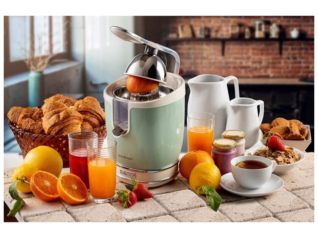 Vintage lis na citrusy • dvě velikosti lisů • odkapávací hrdlo • přísavky pro bezpečné odšťavňování • výkon 85 W