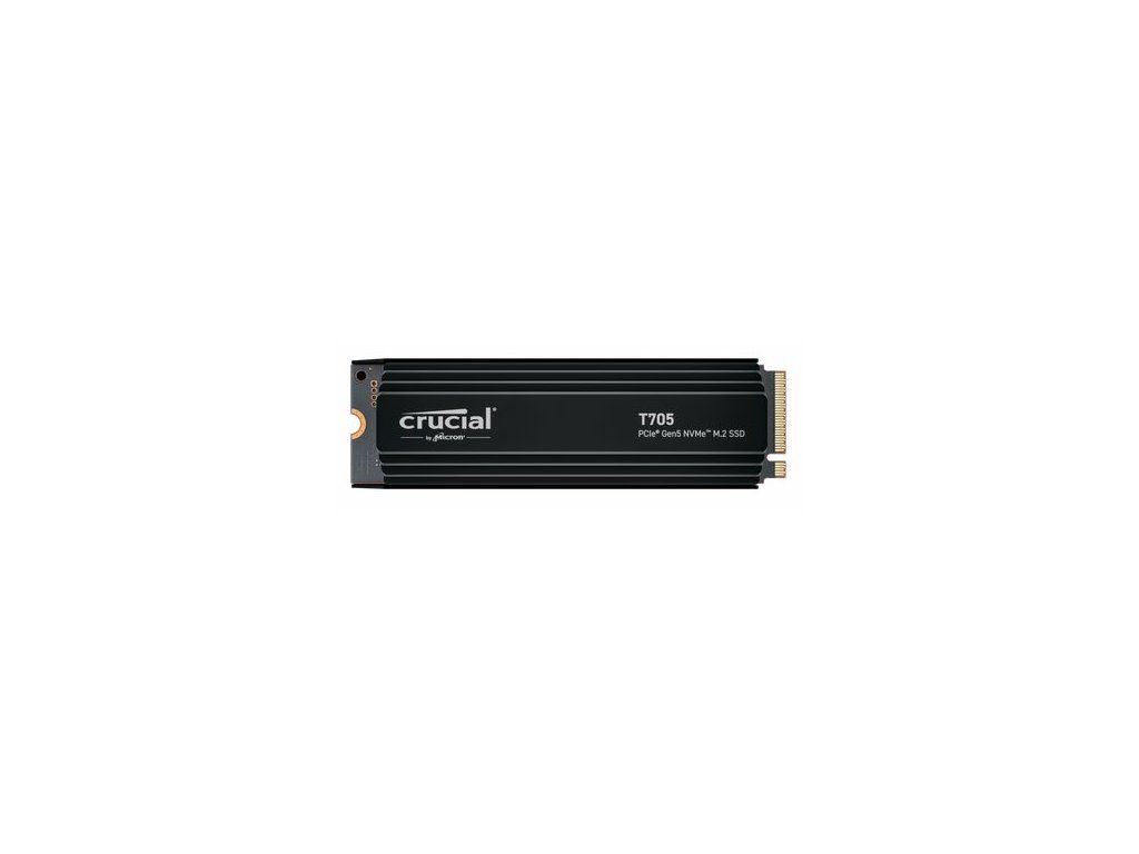 Crucial T705 PCIe Gen5 NVMe SSD Hold on tight — Crucial® T705 Gen5 NVMe® SSD je s využitím Gen5 performance do next level. Fuel vaše gaming, vytvoří na rychlosti nápadů, a výkon prostřednictvím AI aplikací s jasem s tímto plně optimizovaným Gen5 masterpiece, které vlastnosti a premium heatsink pro quiet heat dissipation and sleek design. Blazing fast: Reads/writes up to 14,500/12,700MB/s2 Capacity: 1TB, 2TB, 4TB8 Generation: PCIe® 5.0 NVMe M.2 2280 SSD Innovation: Built with Micron® 232-layer TLC NAND3 Warranty: 5-year limited10 Heatsink: Maximum heat dissipation with noisy fans (non-heatsink option available1) Specifications General tech speInterface PCIe Gen 5.0 x4, NVMe 2.0 SSD Endurance (TBW) 1200TB Form factor M.2 (2280) SSD series T705 Capacity 2TB Speed & timing Sequential Read 14,500 MB/s Sequential Write 12,700 MB/s Warranty & returns Warranty 5-year limited warrantyDoplňkové parametry