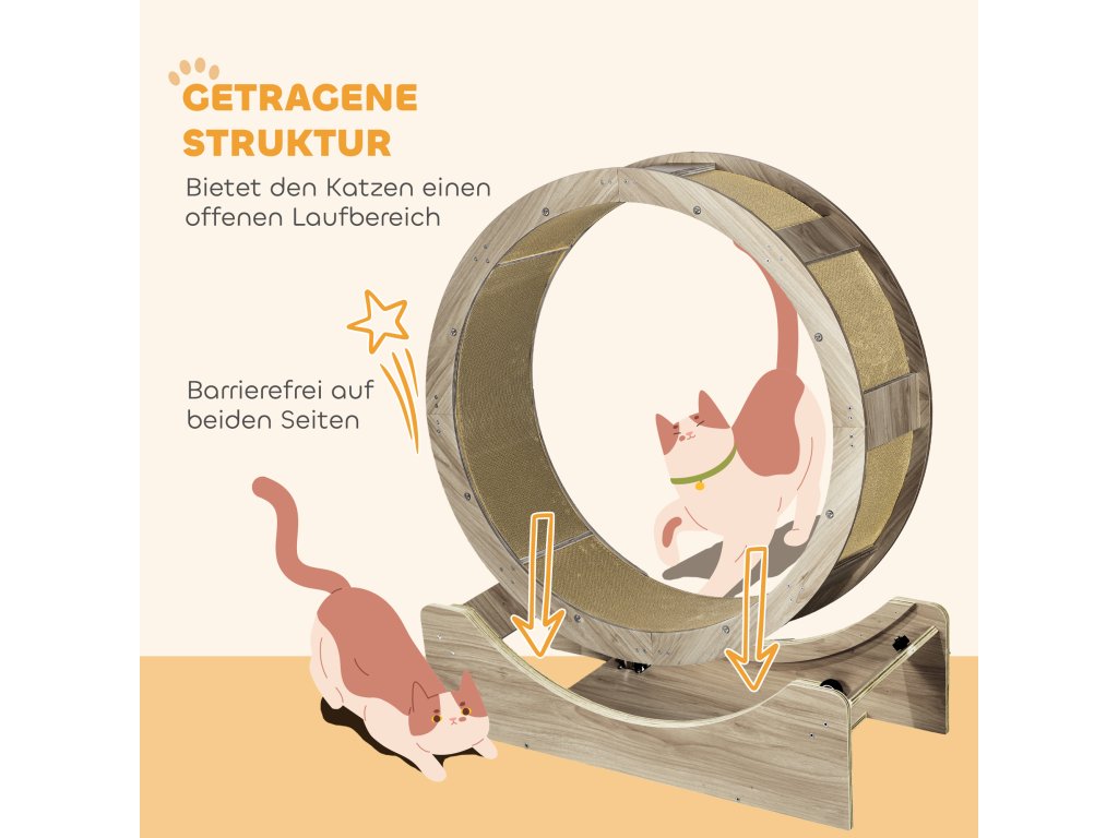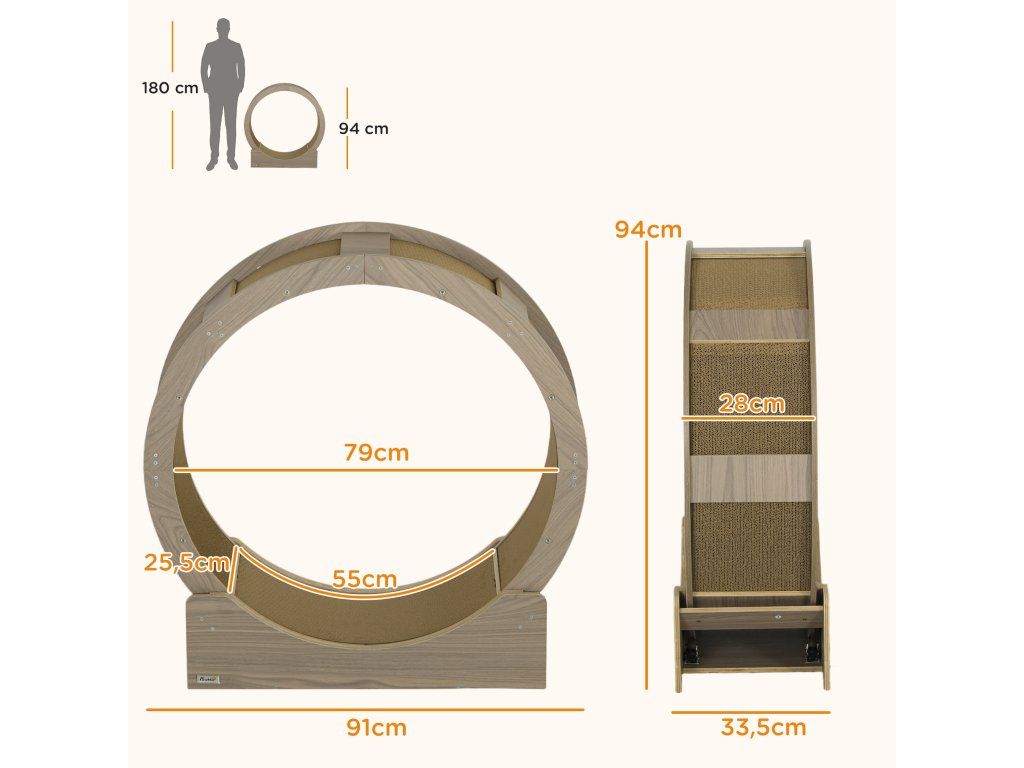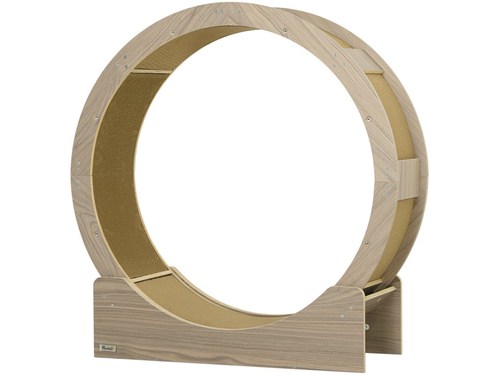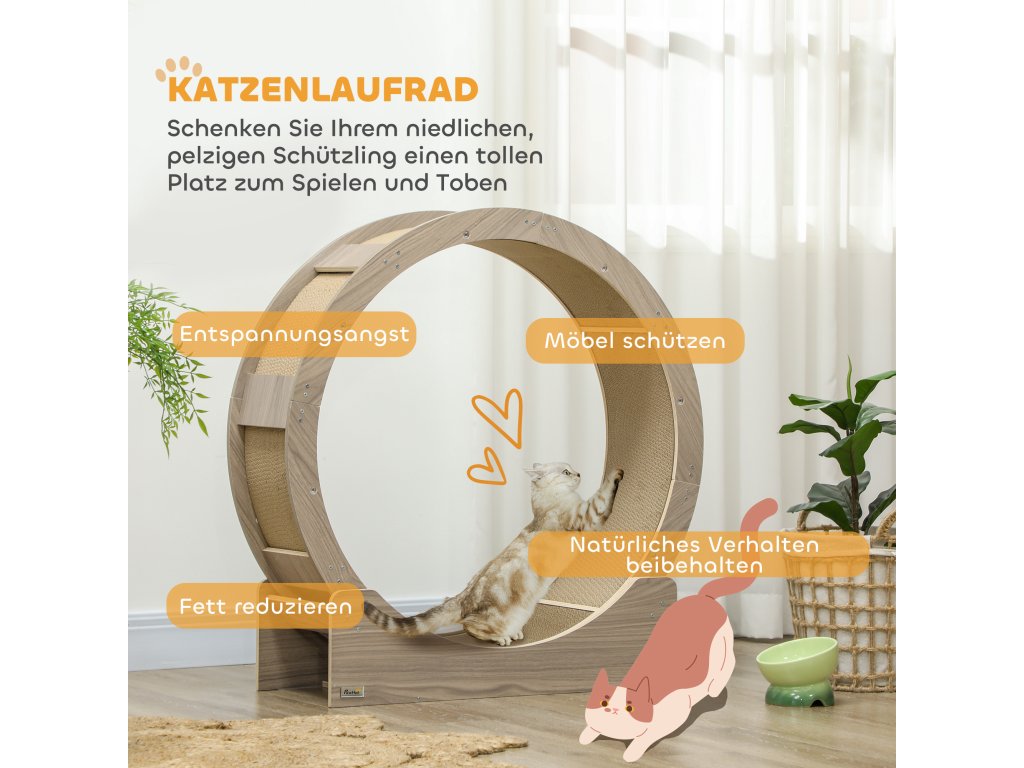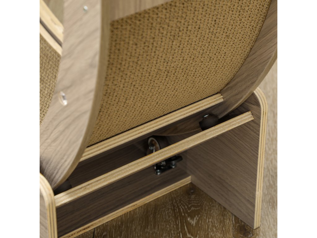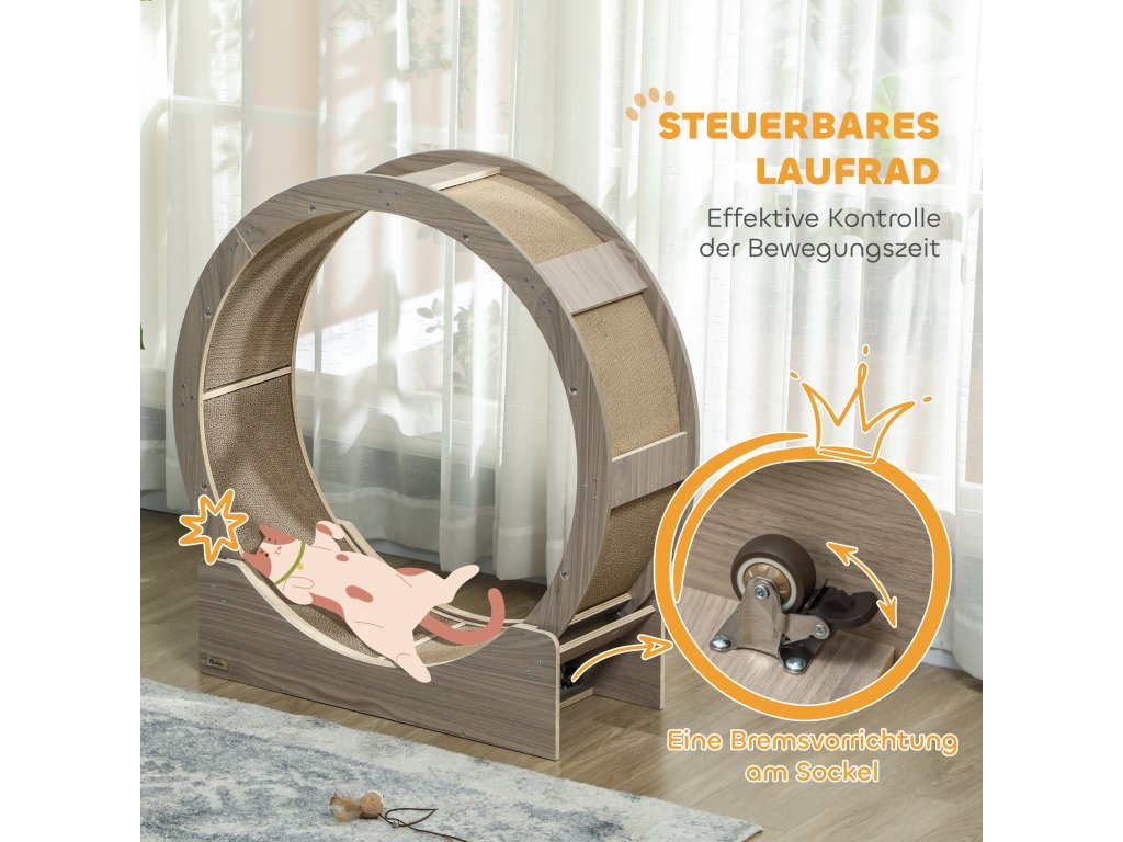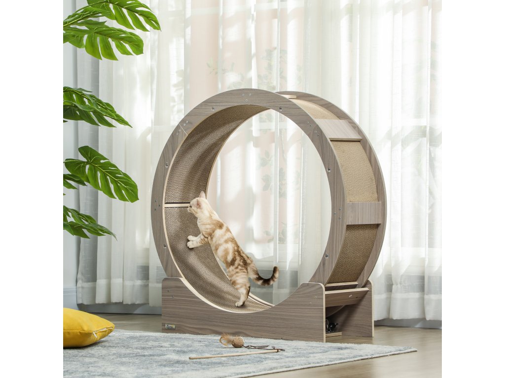 Cvičební kolečko pro kočky PawHut, 91 cm, s brzdou, škrabací podložka, kolečko pro zdravé cvičení koček, ořechové dřevo