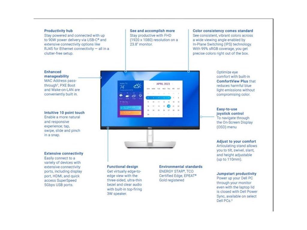 Technická specifikace: MODEL: P2424HT-24 dotykový USB-C monitor Dell DIAGONÁLNÍ POHLEDNÁ VELIKOST: 60,47 cm (23,8 palce) TYP PANELU: Technologie IPS (In-Plane Switching). POZOROVACÍ ÚHLY: 178° vertikálně/178° horizontální VRSTVA DISPLEJE: Antireflexní úprava předního polarizátoru (3H) tvrdá vrstva MAXIMÁLNÍ PŘEDNASTAVENÉ ROZLIŠENÍ: Full HD (1920 x 1080) při 60 Hz POMĚR STRAN: 16:9 ROZTEČ PIXELŮ: 0,2745 mm x 0,2745 mm PIXEL NA PALEC (PPI): 93 JAS: 300 cd/m2 (typ) KONTRASTNÍ POMĚR: 1 000:1 (typický) TECHNOLOGIE BACKLIGHT: LED systém okrajového osvětlení ČAS REAKCE: 5 ms šedá až šedá (rychlá), 8 ms šedá až šedá (normální) BAREVNÝ GAMUT: 99 % sRGB BAREVNÁ HLOUBKA: Až 16,78 milionu NÍZKÉ MODRÉ SVĚTLO: Ano, ComfortView Plus s certifikací TÜV BEZ BLIKÁNÍ: Ano, bez blikání s certifikací TÜV ROZHRANÍ: 1x HDMI1 (HDCP 1.4) 1x DP 1.2 (HDCP 1.4) 1x RJ45 1x audio linkový výstup (3,5mm jack) 1x USB 3.2 Gen1 Type-C (s až 90W PD) 2x USB 3.2 Gen1 Type-A downstream 1x USB 3.2 Gen1 Type-C downstream (s až 15W PD) 1x USB 3.2 Gen1 Type-A downstream (s BC1.2 až 10W) NASTAVITELNOST: Výška, otáčení, sklon a sklon NASTAVENÍ VÝŠKY: Až 110,52 mm (4,35 palce) ÚHOL OTOČENÍ:-30°/30° ÚHLY SKLONU:-4°/4° ÚHLY NÁKLONU:-5°/+60° MONTÁŽNÍ ROZHRANÍ VESA: 100 mm x 100 mm DOTYKOVÁ FUNKČNOST: 10bodový dotek pro WinOS a MacOS, 3bodový dotek pro Linux ZVUK: 1x 3W mono SOFTWAROVÁ PODPORA PRODUKTIVITY: DDM s Dell Easy Arrange SLOT BEZPEČNOSTNÍHO ZÁMKU: Ano, na základě bezpečnostního slotu Kensington™ OSTATNÍ: Dell Power Button Sync (DPBS) POŽADOVANÉ NAPĚTÍ: 100 VAC až 240 VAC/50 Hz nebo 60 Hz ± 3 Hz/2,0 A (typ) SPOTŘEBA ENERGIE: 0,3 W (vypnutý režim), 0,5 W (pohotovostní režim), 18 W (zapnutý režim), 190 W (max.) TŘÍDA ENERGETICKÉ ÚČINNOSTI (STUPNICE A AŽ G): E ROZMĚRY (V x Š x H)-PLNÝ MONITOR: 320,98 mm x 538,80 mm x 248,87 mm, (12,64 palce x 21,21 palce x 9,80 palce) ROZMĚRY (V x Š x H)-POUZE PANEL (PRO MONTÁŽ VESA): 320,98 mm x 538,80 mm x 54,10 mm, (12,64 palce x 21,21 palce x 2,13 palce) HMOTNOST – PLNÝ MONITOR: 7,86 kg (17,33 liber) HMOTNOST – POUZE PANEL (PRO MONTÁŽ VESA): 3,86 kg (8,51 liber) CERTIFIKOVANÉ ENERGY STAR®: Ano VYHOVUJÍCÍ EPEAT: Zlato CERTIFIKOVANÉ TCO: TCO 9 a TCO Certified Edge V SOULADU s RoHS: Ano ROZSAH TEPLOTY: Provoz: 0°C ~ 40°C (32°F ~ 104°F) ROZSAH VLHKOSTI: Provozní: 10% ~ 80% (bez kondenzace) CO JE ZAHRNUTO: 1x Panel monitoru 1x Stojanová stupačka 1x Základna stojanu 1x Kryt kabelu 1x Napájecí kabel 1x kabel DP 1.2, DP-to-DP (1,8 m) 1x upstream kabel USB 3.2 Gen1 typu C-to-C (1,8 m) 1x USB 3.2 Gen1 typ C-to-A upstream kabel (1,8 m) 1x Průvodce rychlým nastavením 1x Bezpečnostní, environmentální a regulační informace STANDARDNÍ ZÁRUKA: 3letá omezená záruka na hardware se službou Advanced Exchange Service a Premium Panel Exchange.Doplňkové parametry