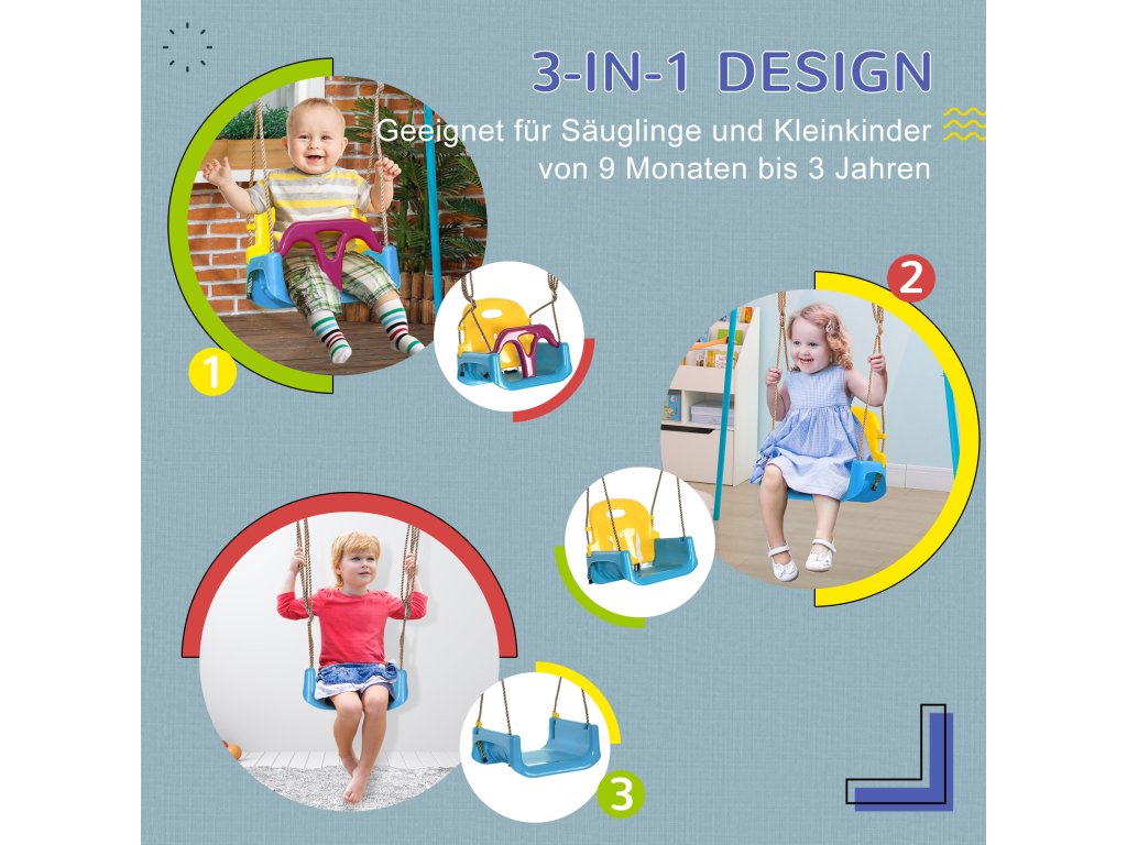 - konstrukce 3 v 1: Vynikající dětská houpačka pro miminka a batolata. Jak dítě roste, lze opěrku zad a ochranu proti pádu v případě potřeby odejmout. Jedná se o fantastický dárek, díky kterému mohou vaše děti zažívat nezapomenutelnou zábavu při houpání po celý rok.