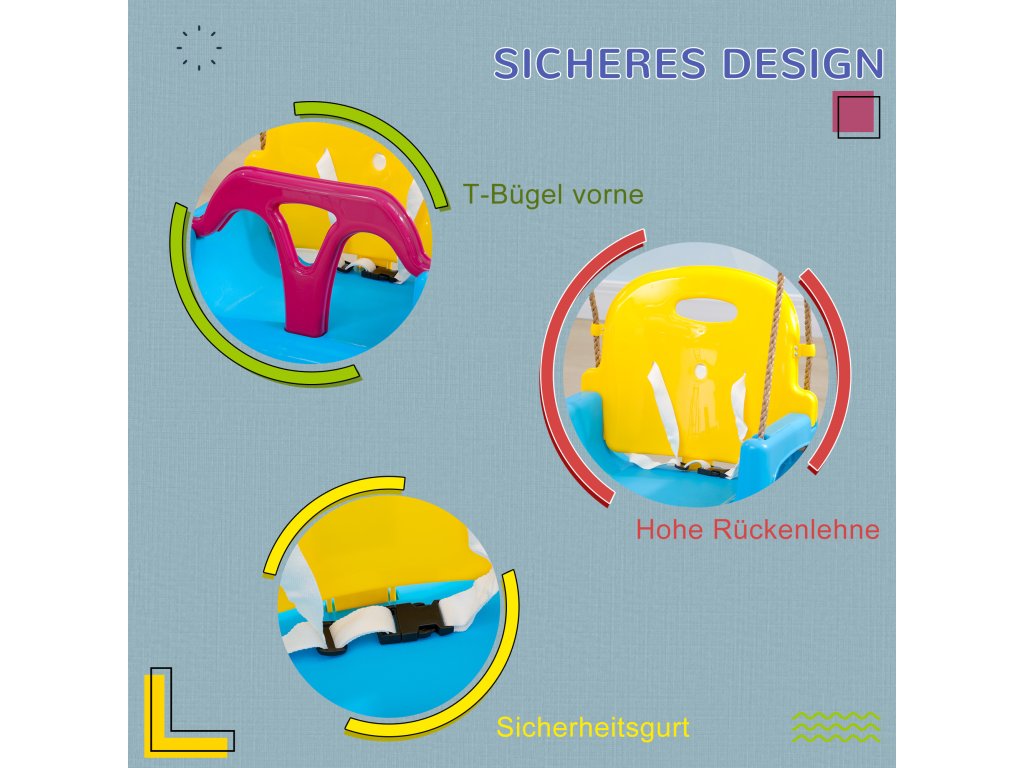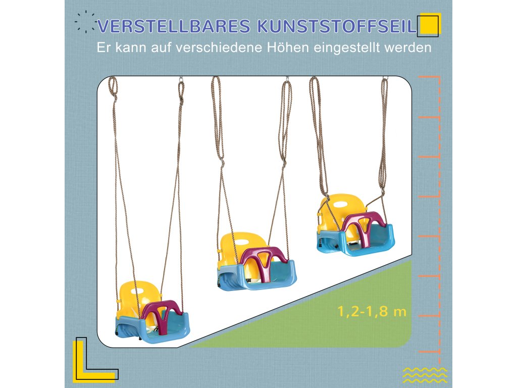 - Údaje o výrobku: Sedačka je určena pro děti, které se mohou houpat na houpačce: Celkové rozměry: 42L x 33W x 120-180V cm. Vhodné pro děti ve věku od 9 do 36 měsíců. Nosnost: 70 kg. Nutná montáž.