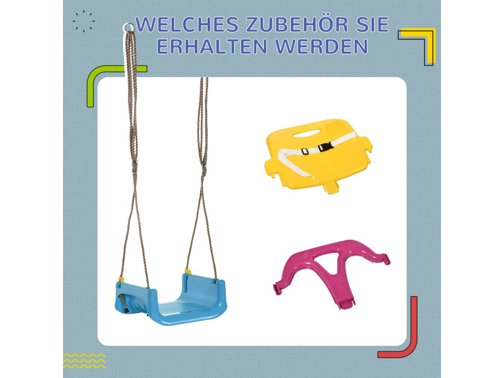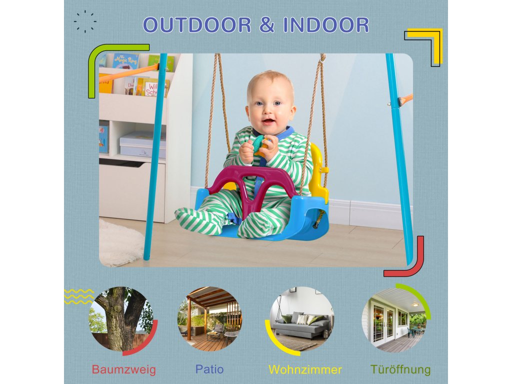 Dětská houpačka Outsunny 3 v 1, výškově nastavitelná, odnímatelné opěradlo, pro vnitřní i venkovní použití, modrá+žlutá, 42 x 33 x 180 cm