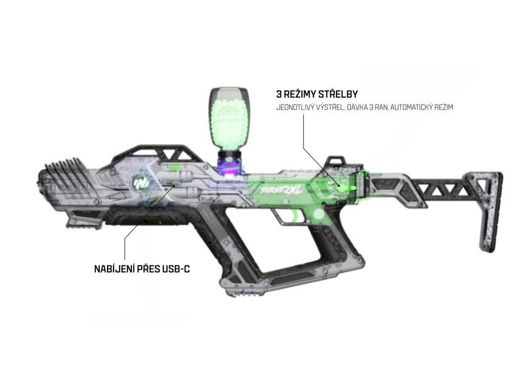 Seznam se s Gel Blaster Surge 2 XL, který posouvá hranice zábavy díky kombinaci špičkového výkonu, ergonomického designu a stylu. Tento model je vybaven integrovým Starfire Activatorem pro hru za tmy, což eliminuje potřebu další baterie. Nový průhledný design Translucent Electric Green s podmanivými bílými akcenty dělá ze Surge XL nejen účinný, ale také stylový blaster.