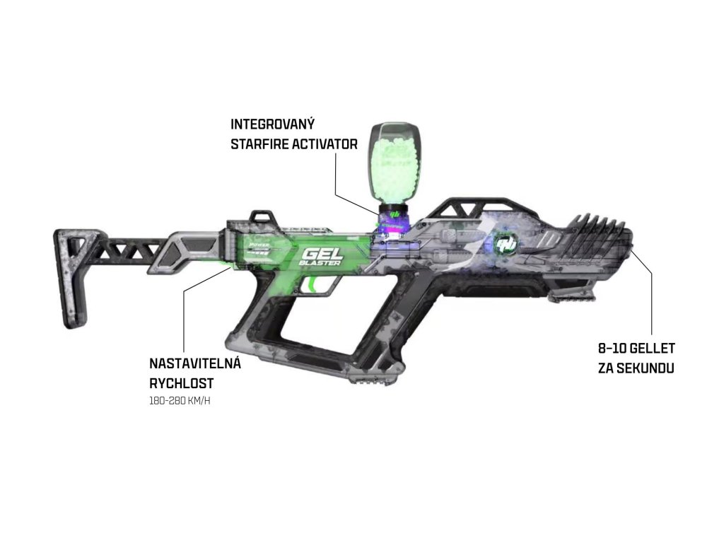 Uprav si rychlost střelby podle vlastních potřeb – od 50 do 70 metrů za sekundu. To ti umožní přizpůsobit intenzitu hry, například při hře s nováčky. Můžeš také vystřelit až 8-10 Gelletů za sekundu, což dodává tvojí hře dynamiku a akci.